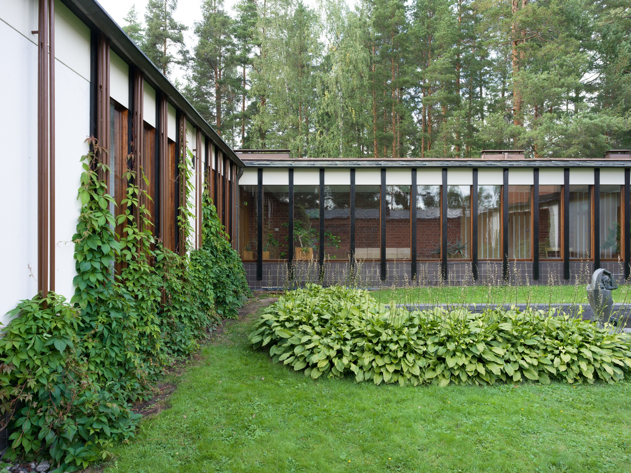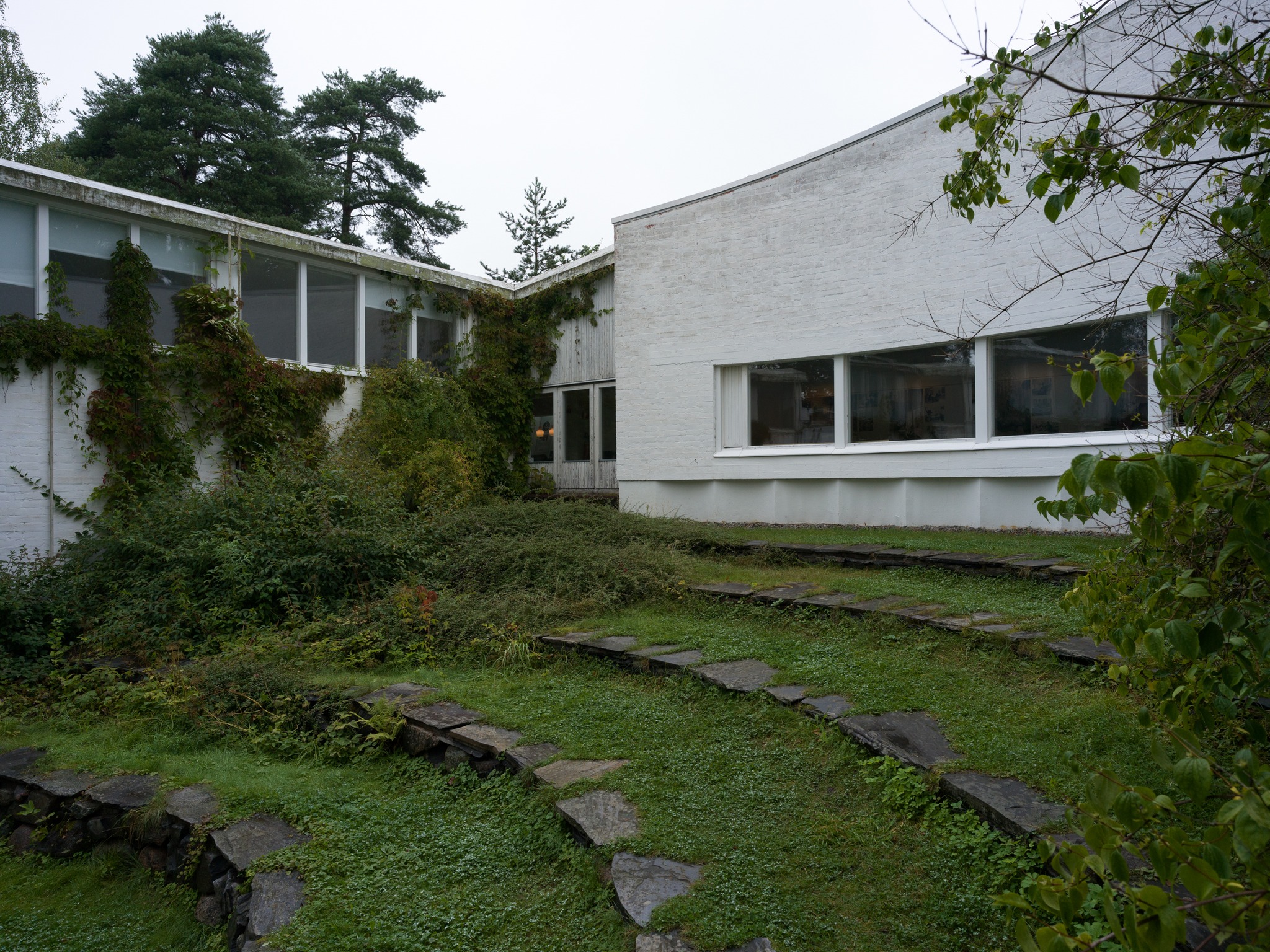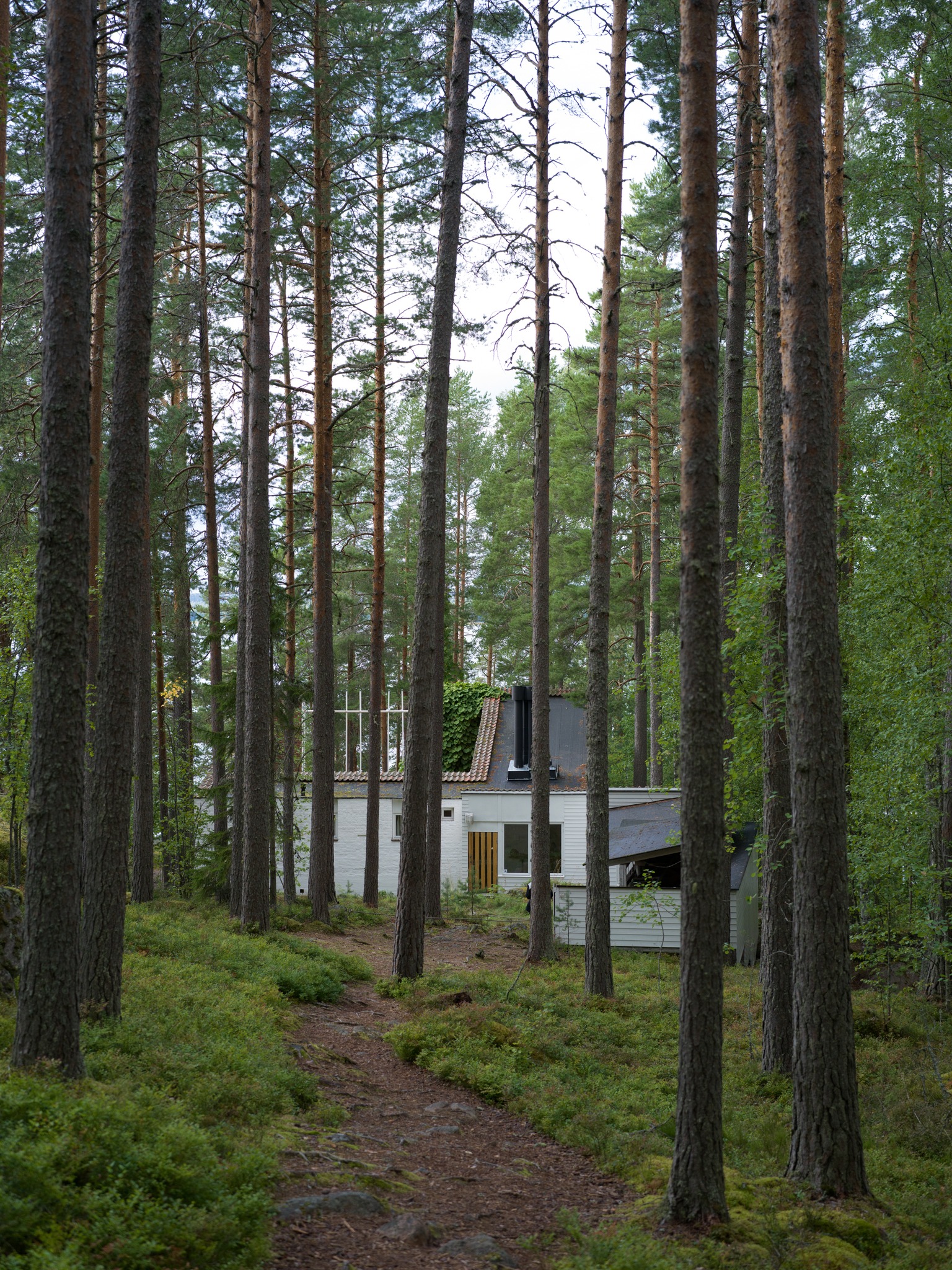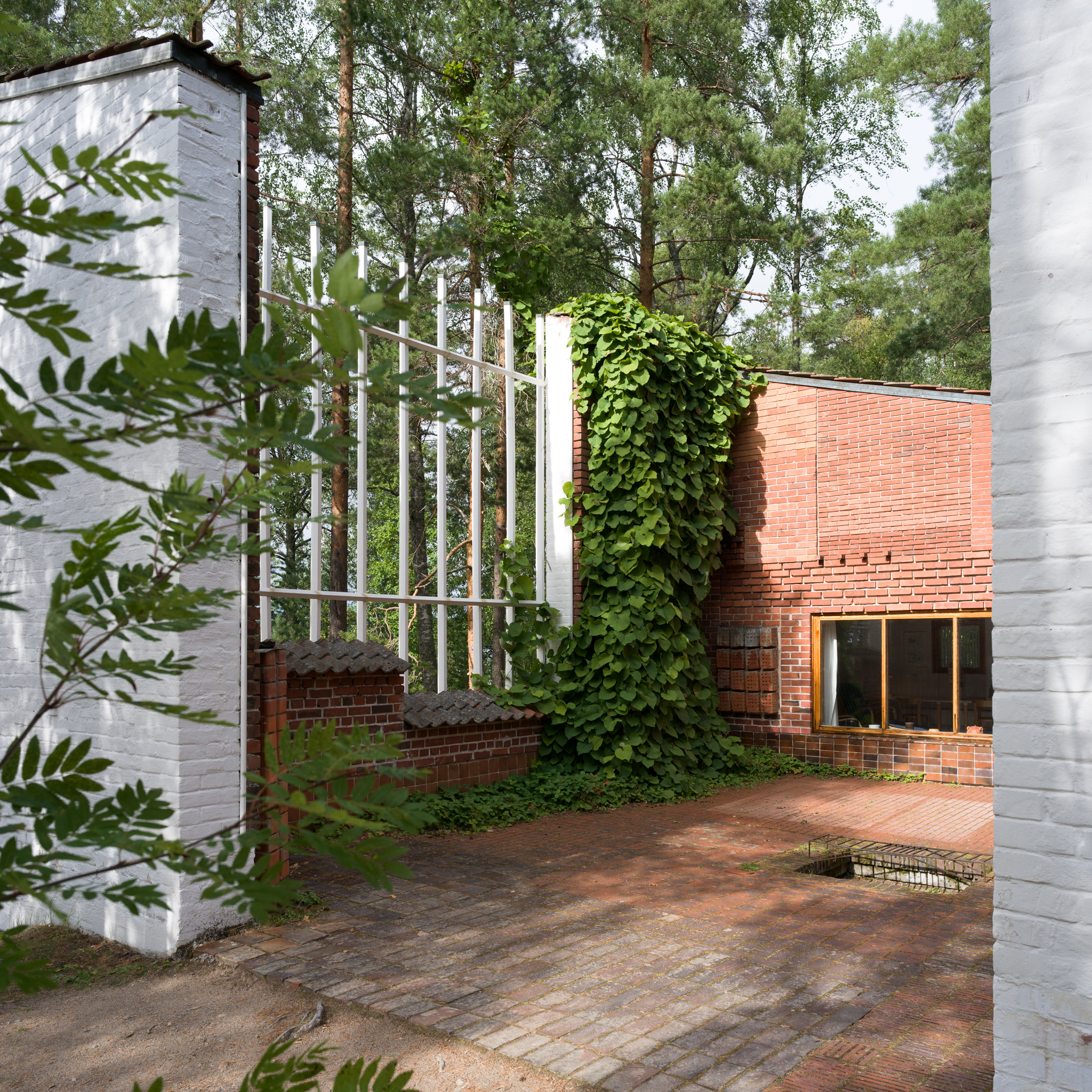 Alvar Aalto Experimental House。建築師1950-52年間,在距離赫爾辛基270km的小島上、蓋了一間充滿實驗性的度假小屋。從入口走五分鐘的林間小徑(建築師當年都是開船來、島上鳥無人煙也沒路)、就可看見隱沒在森林裡的白色小屋背面。中庭由磚造牆圍起一個正方形、中央有個火爐、這個向內的中庭往湖的方向開了一個破口、建築師故意製造一種破舊時間感、也讓植物順著牆蔓延內外。 各種紅磚的實驗砌法、還有其他案子用到的磁磚、都被他玩性大發的拼貼在牆上、也是這個屋子最迷人的地方。 他也蓋了一間桑拿房(至今他的孫子都常來使用)。建築師每天都會在湖邊游1km,他太太則開船跟著免得他溺水。他的船也是自己設計的、雖然不甚滿意但還堪用。 我們待著待著都忘了還要開三個多小時回程、人生如(Alvar Aalto)此、夫復何求。