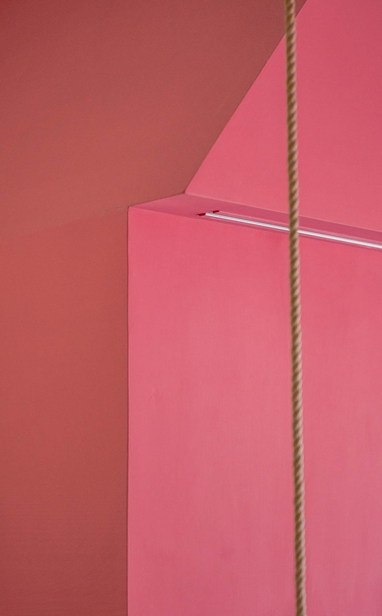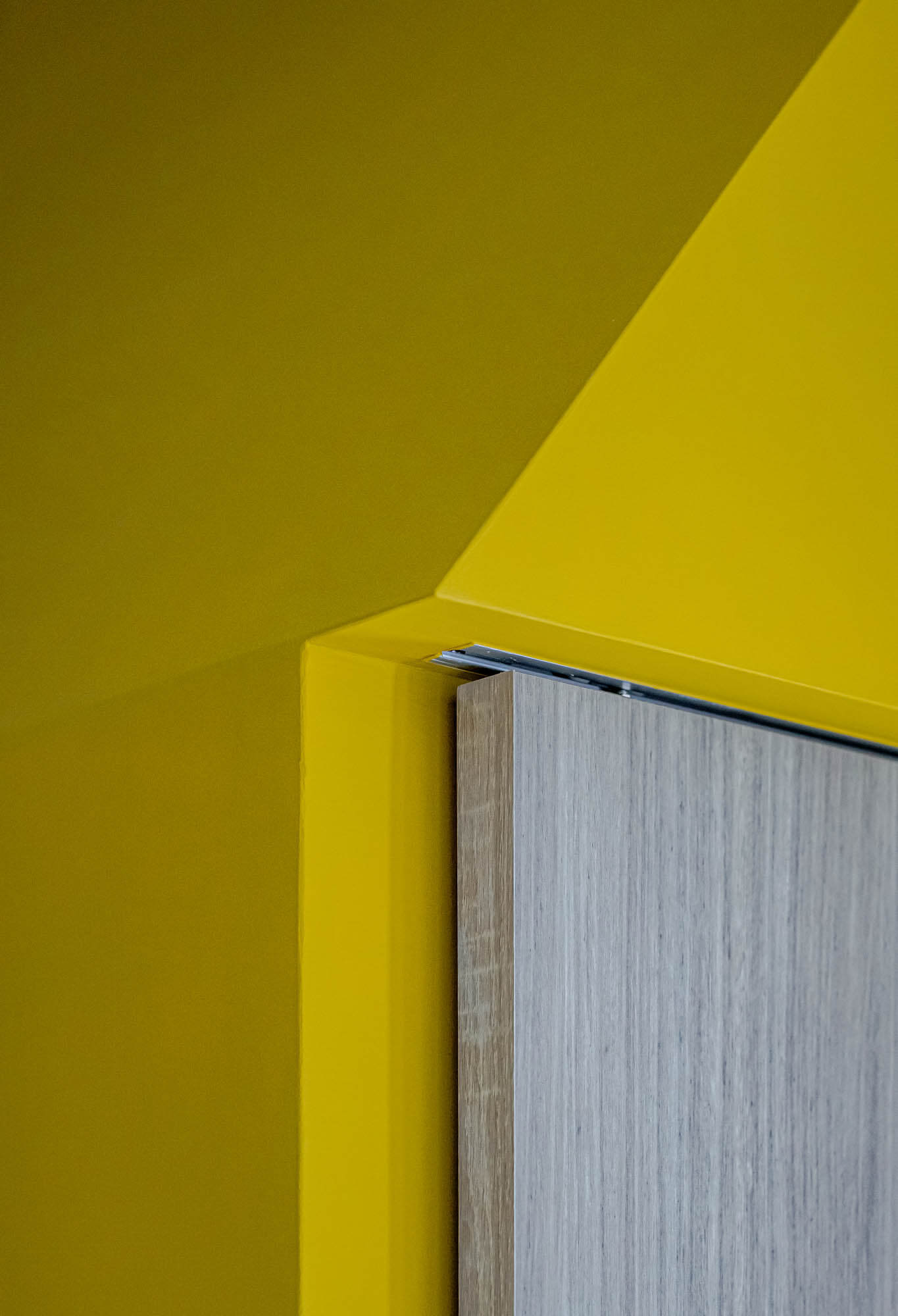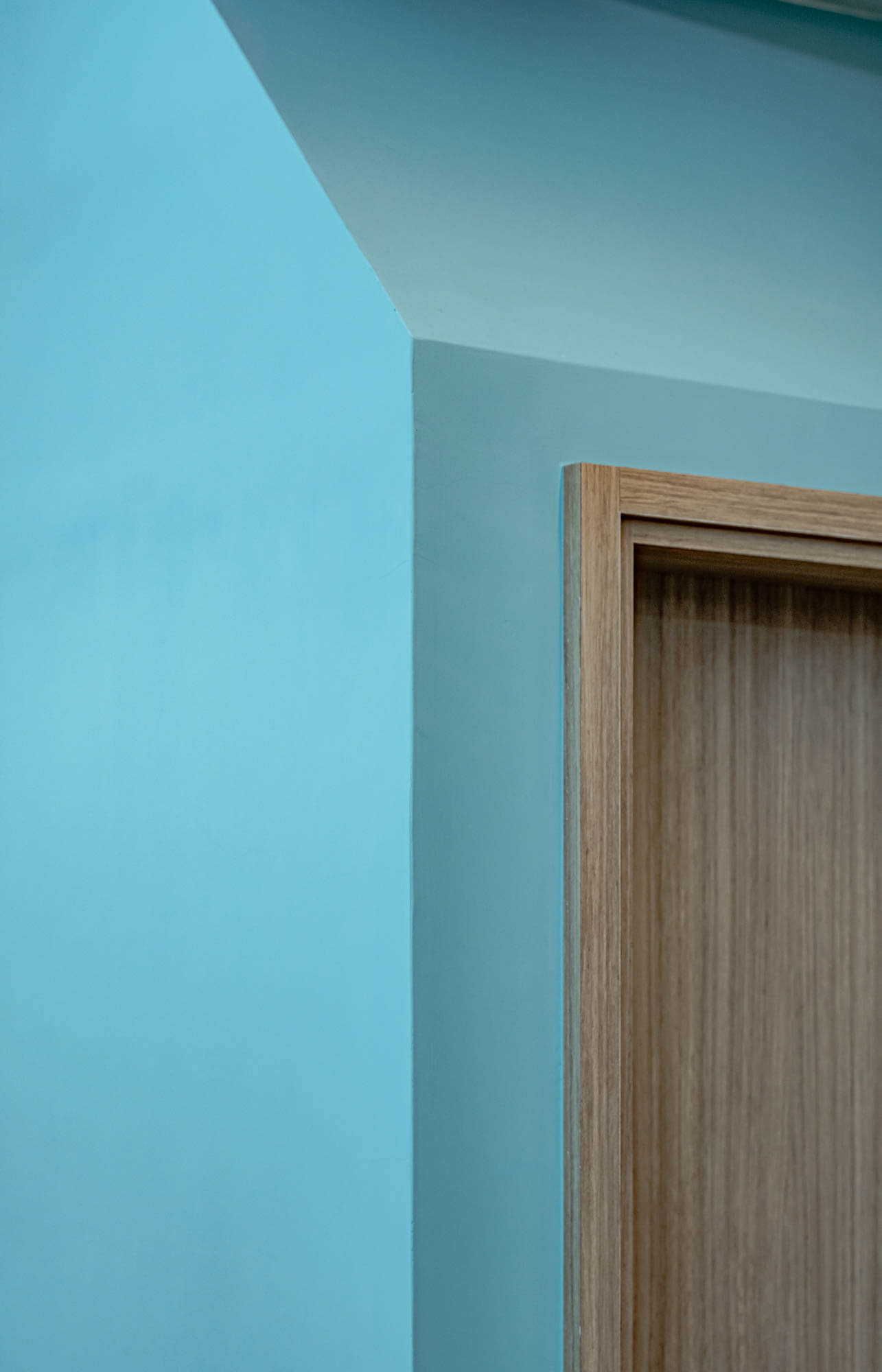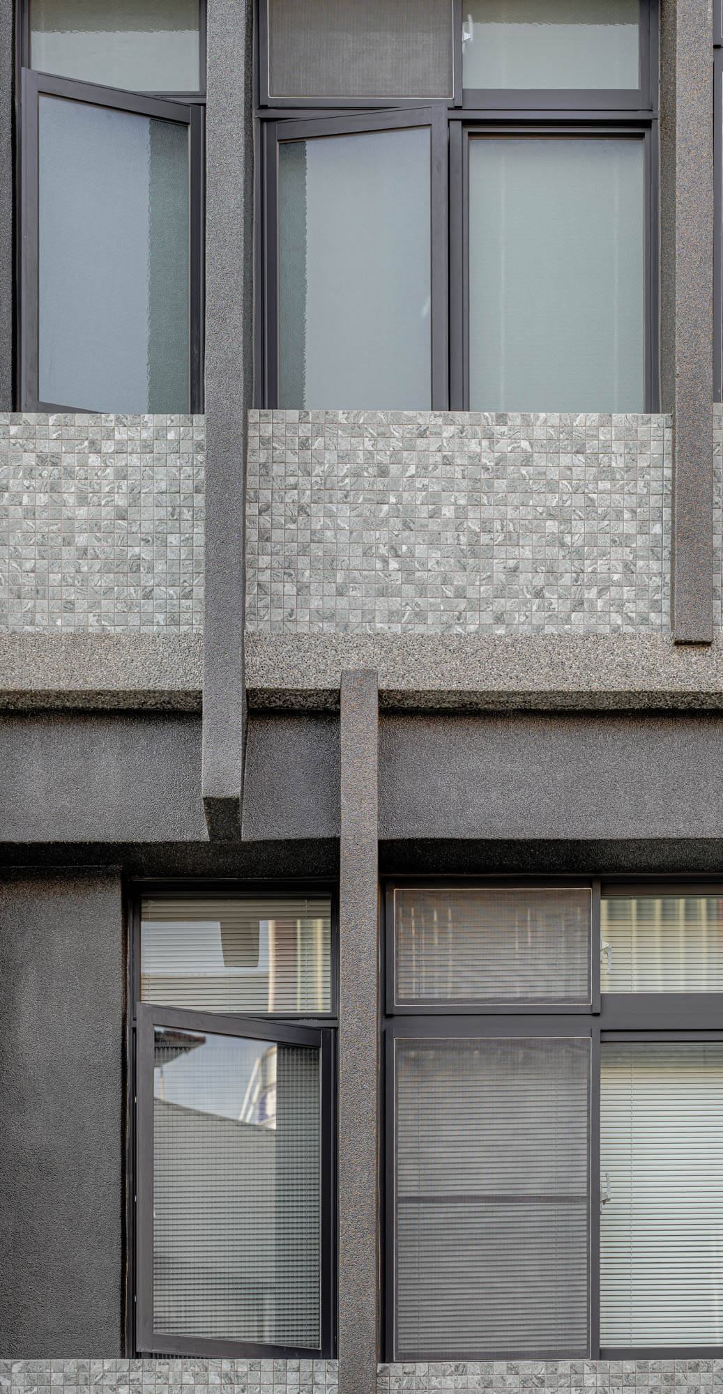 主要的立面分割暗示了室內空間的配置,材質用了同色系的抿石子(五種深淺)與復古的石紋馬賽克,讓原本比別人寬兩倍臨街面不過於鬆散,巧妙的與左右兩側的街屋對話. 室內充滿著飽和色彩,這些都是業主(其實已經有收斂不然應該會超過50種顏色)與我們一起努力的成果,每個角落都充滿驚喜,看攝影師給了近兩百張照片就知道這棟房子帶來很多完全不一樣的火花. 這個設計帶給我們的,不是達成一個目標,而是一場探險!