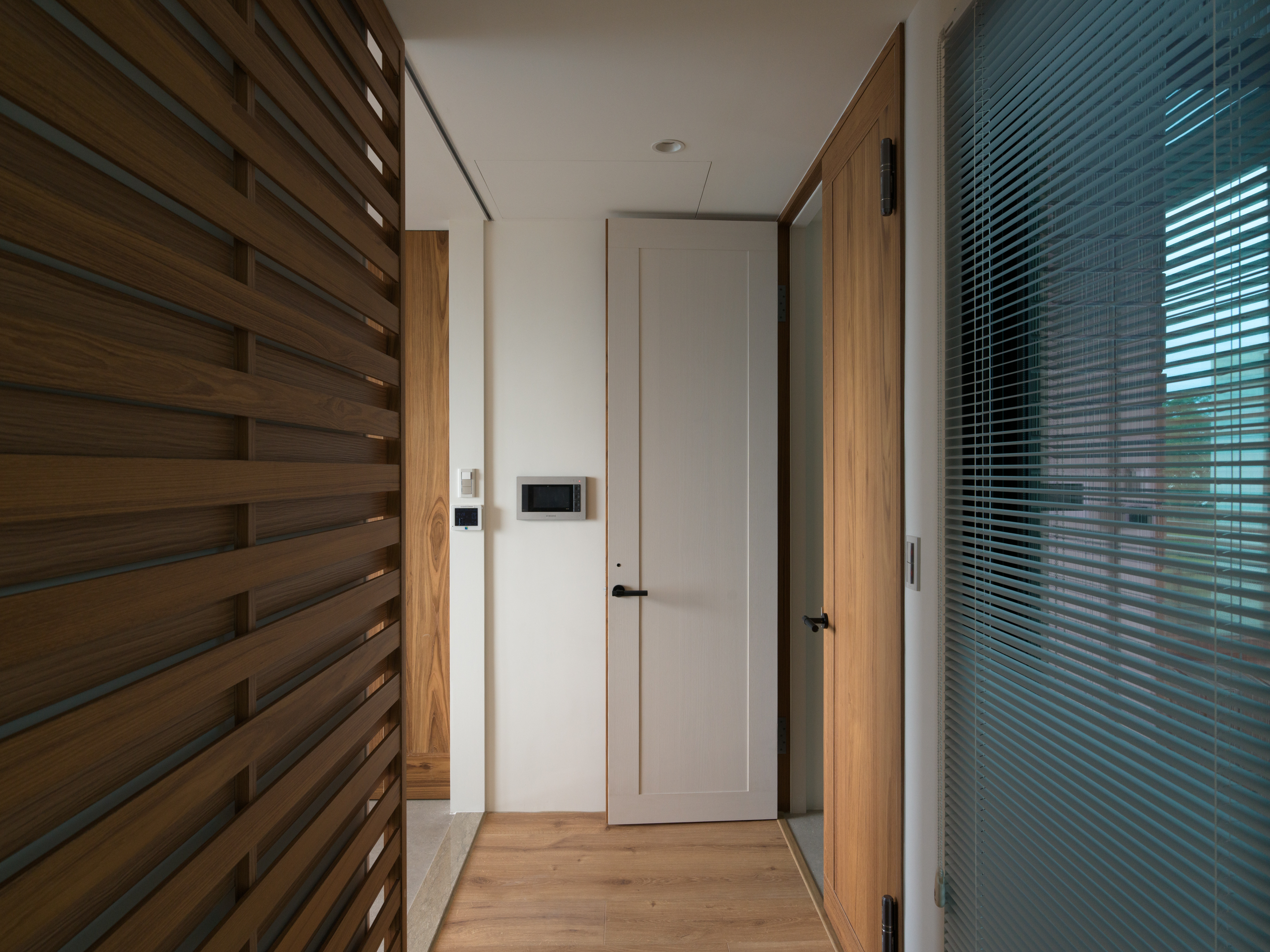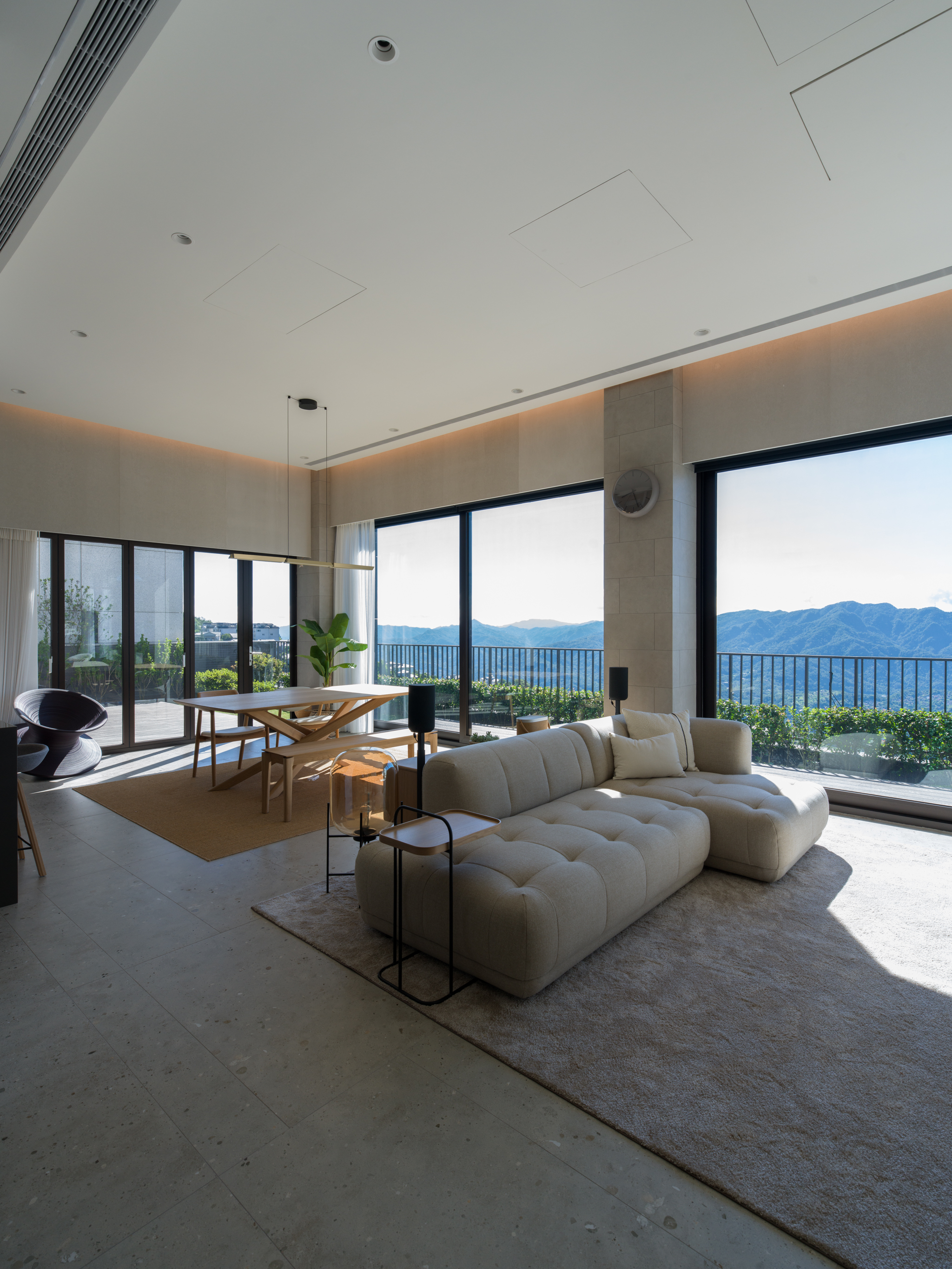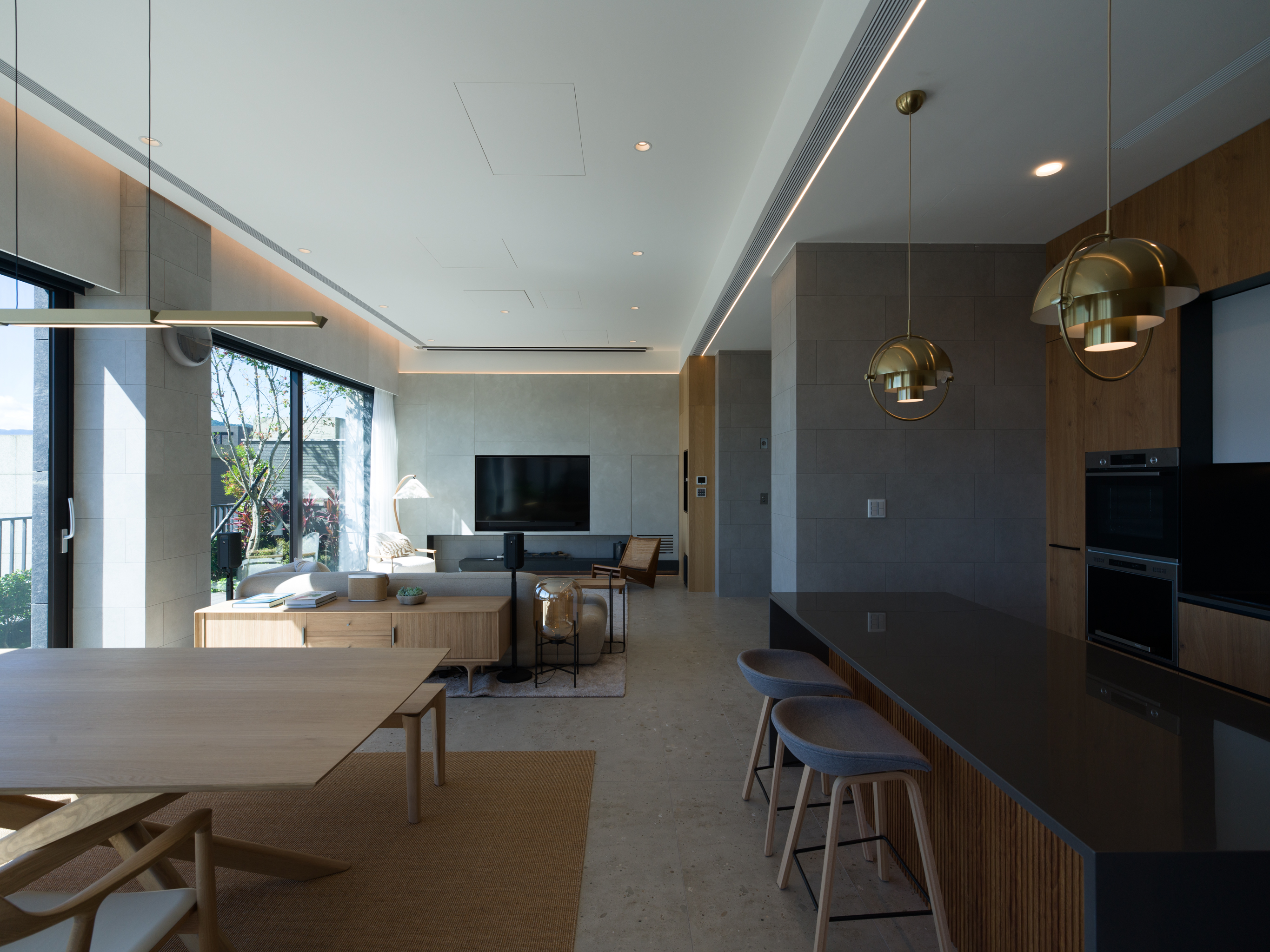 這個位於新店郊區的案子,有著得天獨厚的窗外風景。業主選擇此處作為周末假期的休閒居所,希望可以用簡約的配置與材質,把空間留給窗外的大自然。 客餐廳與廚房位於建築物的二樓,地面層為車庫。由於地勢的關係,客餐廳的大面落地窗可以毫無阻礙的遙望遠方山景,欣賞四季變換。考量當地氣候變化與居住性質,我們在地坪與牆面都使用磁磚。並藉由不同的交丁鋪設方式,豐富材質本身的紋理。統一木作、家具與廚具的材質,把顏色的變化降低,焦點回歸窗外景色。