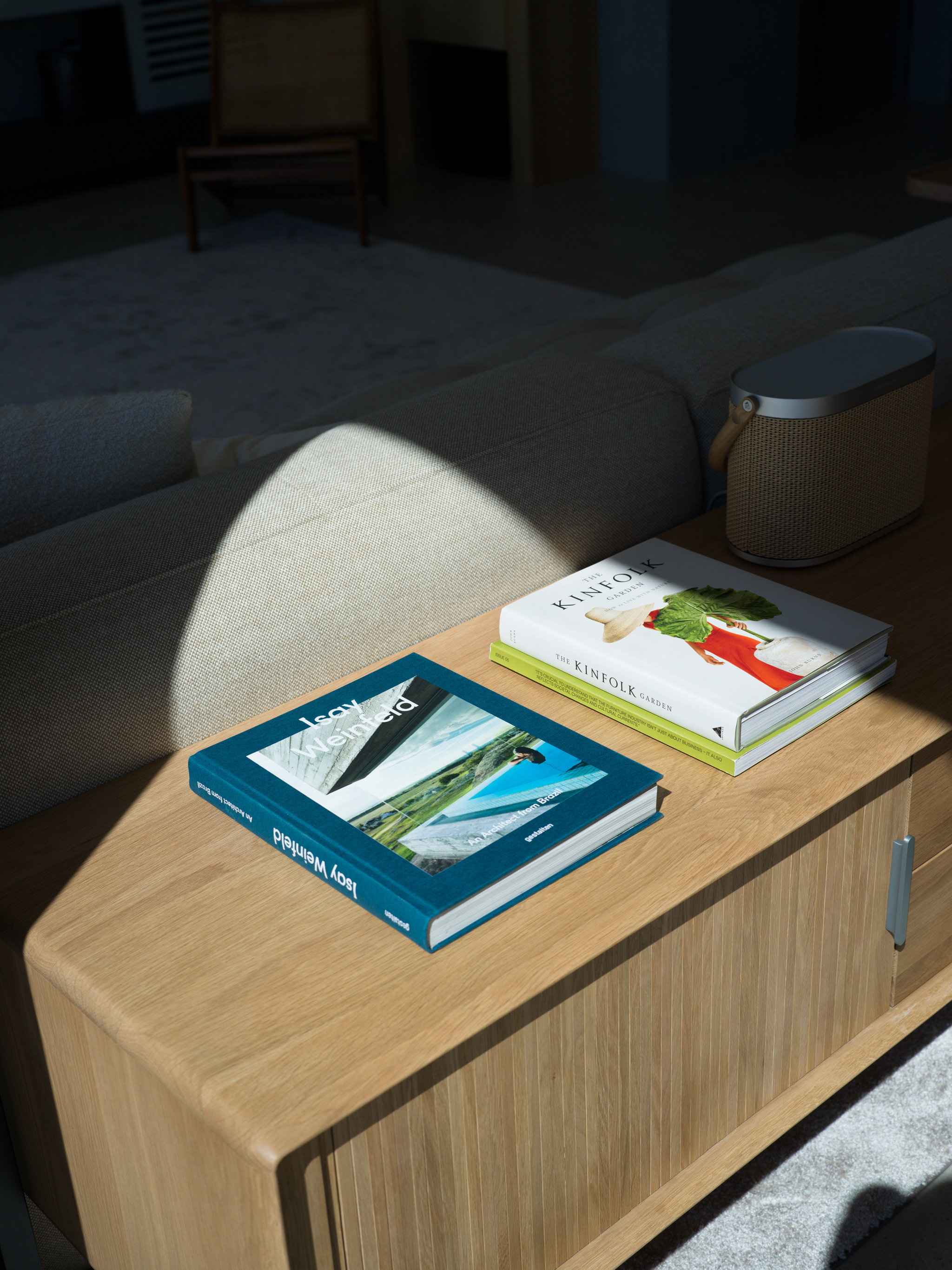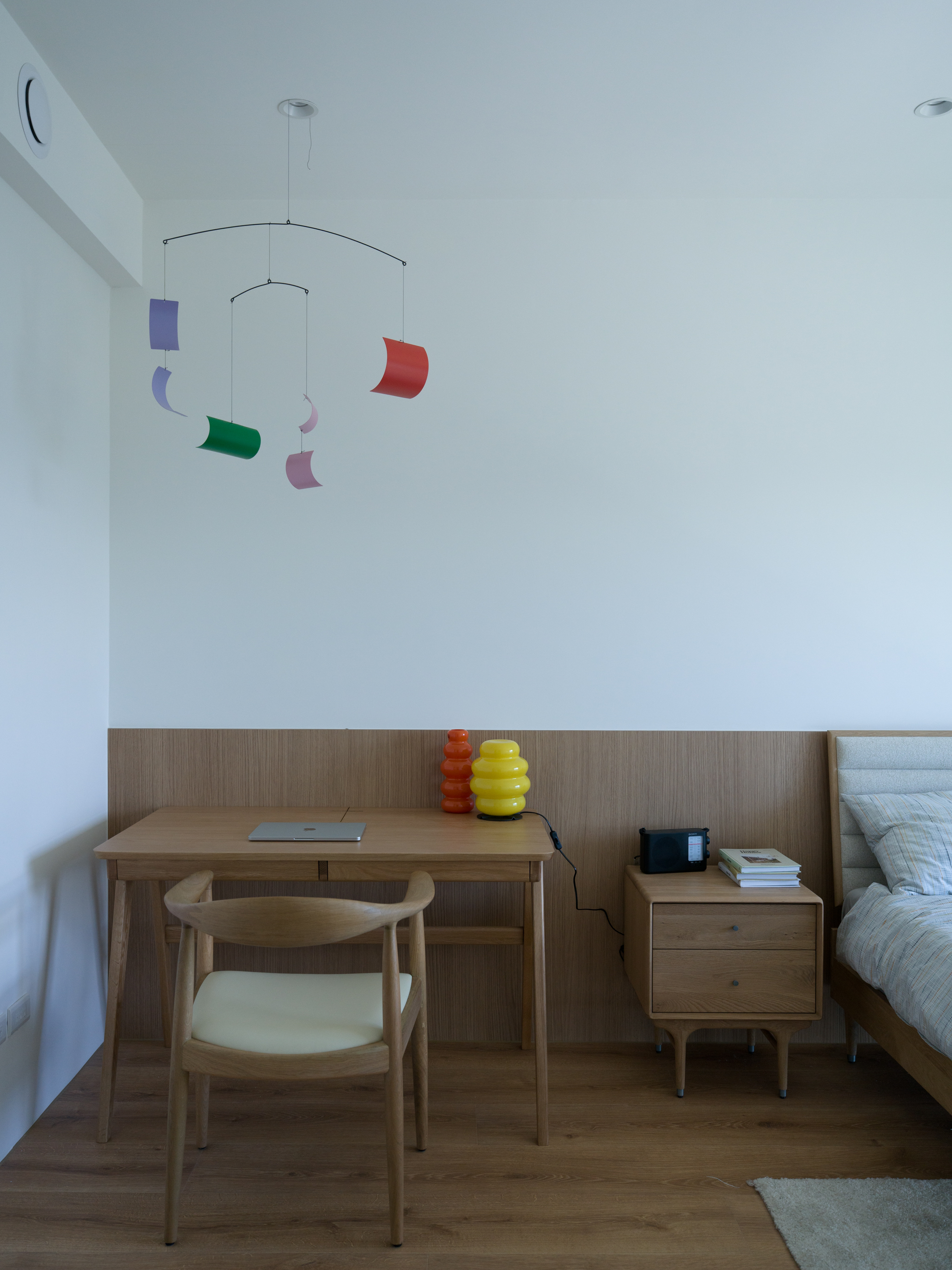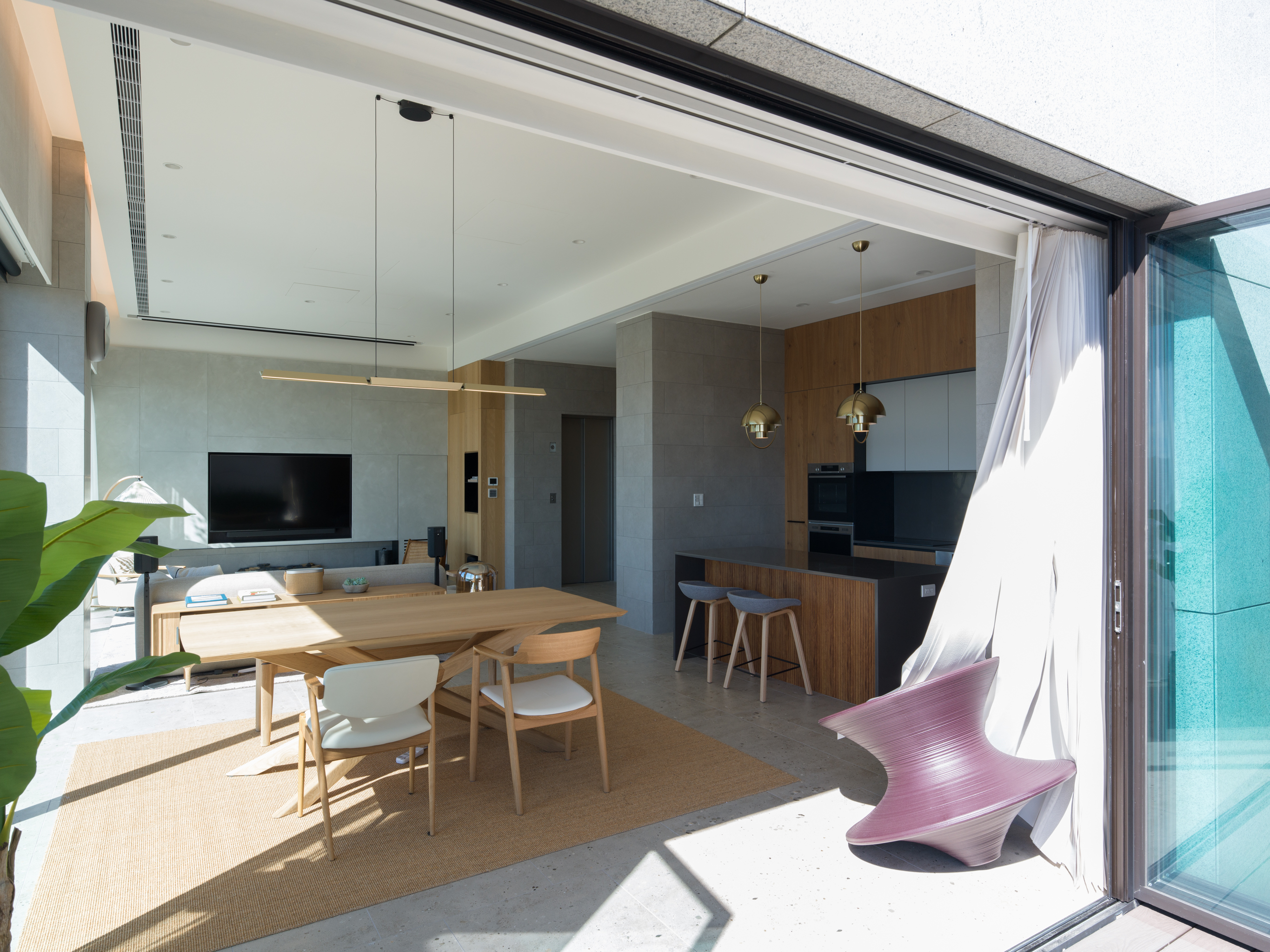 這個位於新店郊區的案子,有著得天獨厚的窗外風景。業主選擇此處作為周末假期的休閒居所,希望可以用簡約的配置與材質,把空間留給窗外的大自然。 客餐廳與廚房位於建築物的二樓,地面層為車庫。由於地勢的關係,客餐廳的大面落地窗可以毫無阻礙的遙望遠方山景,欣賞四季變換。考量當地氣候變化與居住性質,我們在地坪與牆面都使用磁磚。並藉由不同的交丁鋪設方式,豐富材質本身的紋理。統一木作、家具與廚具的材質,把顏色的變化降低,焦點回歸窗外景色。