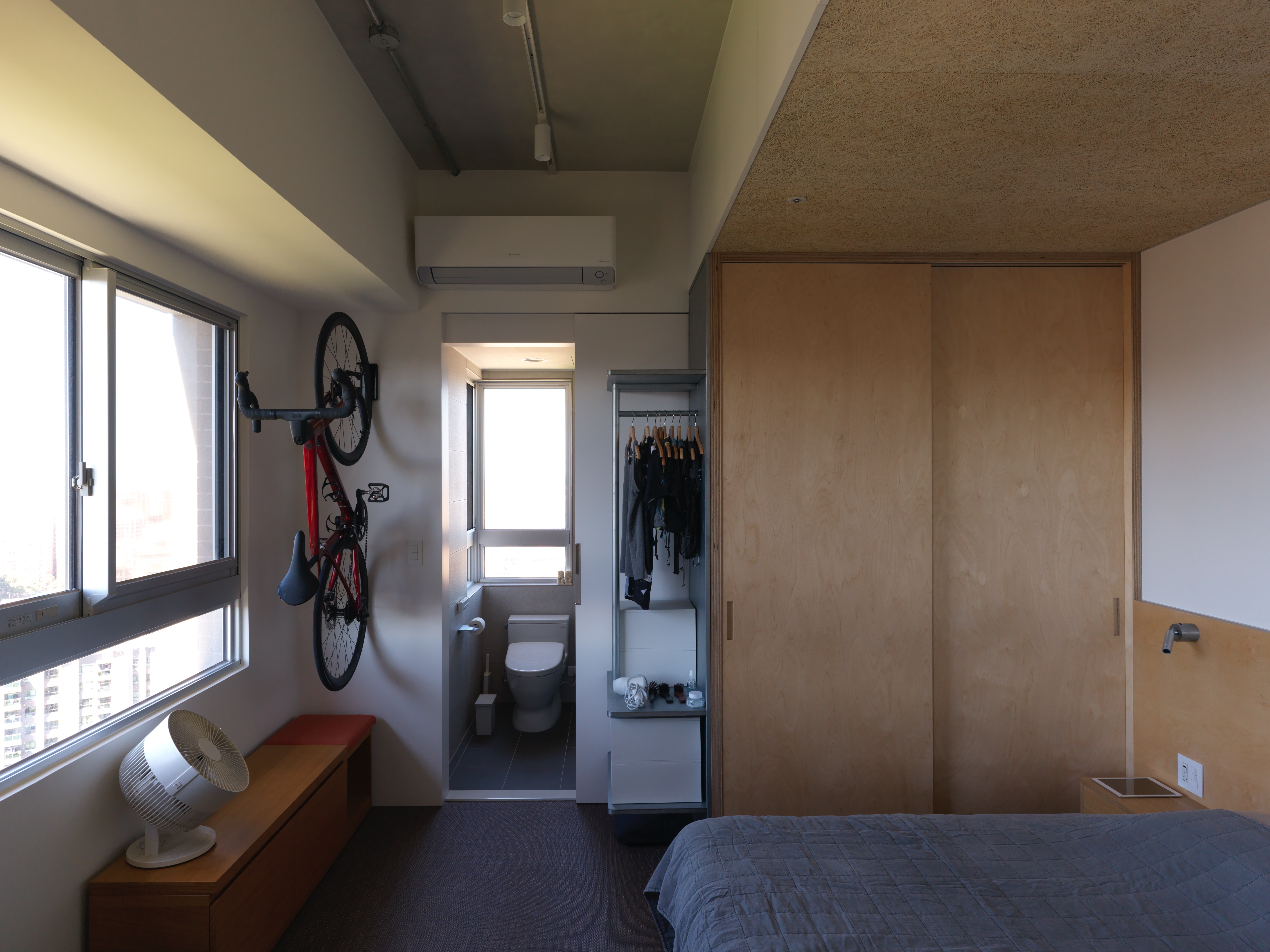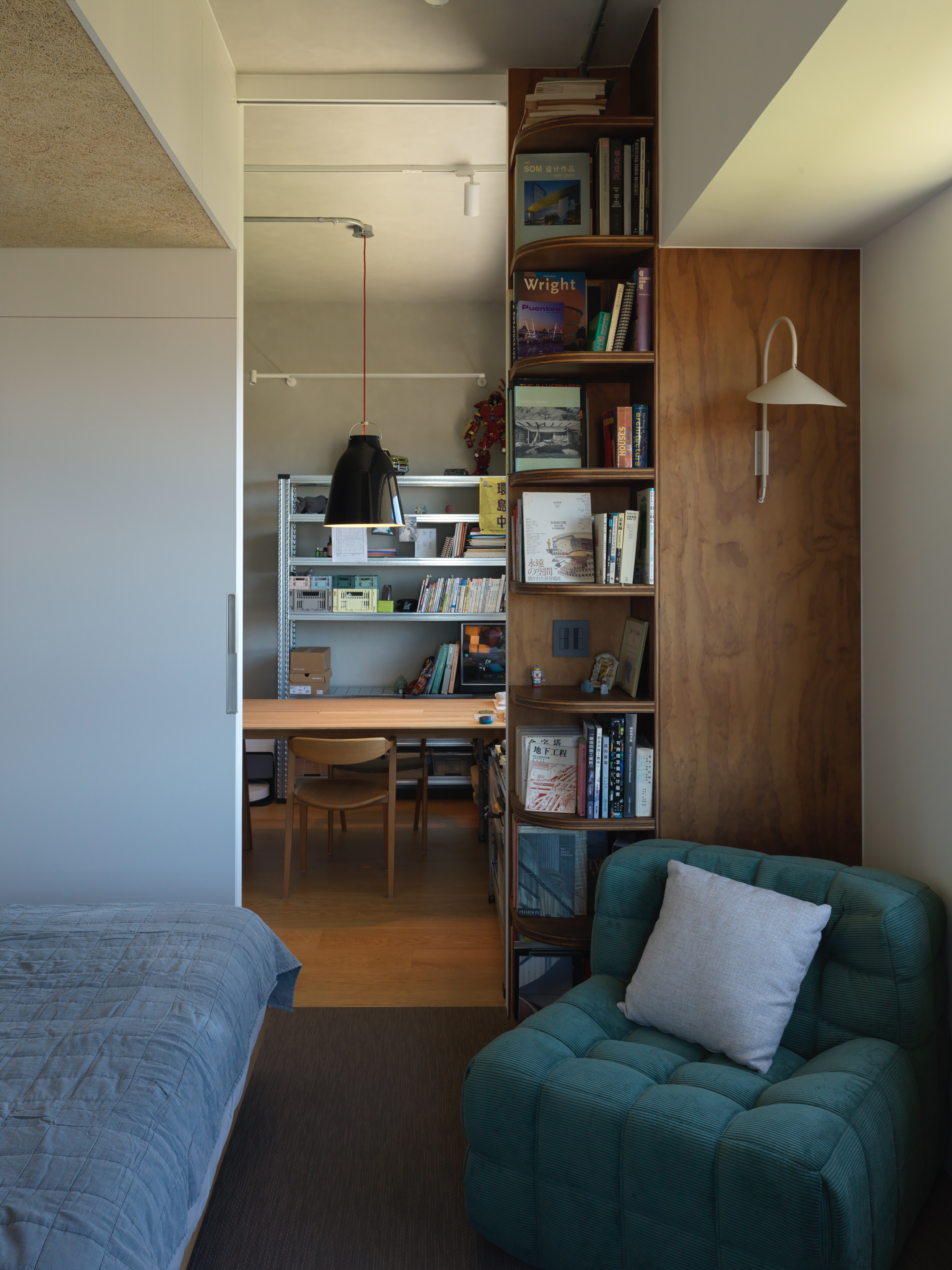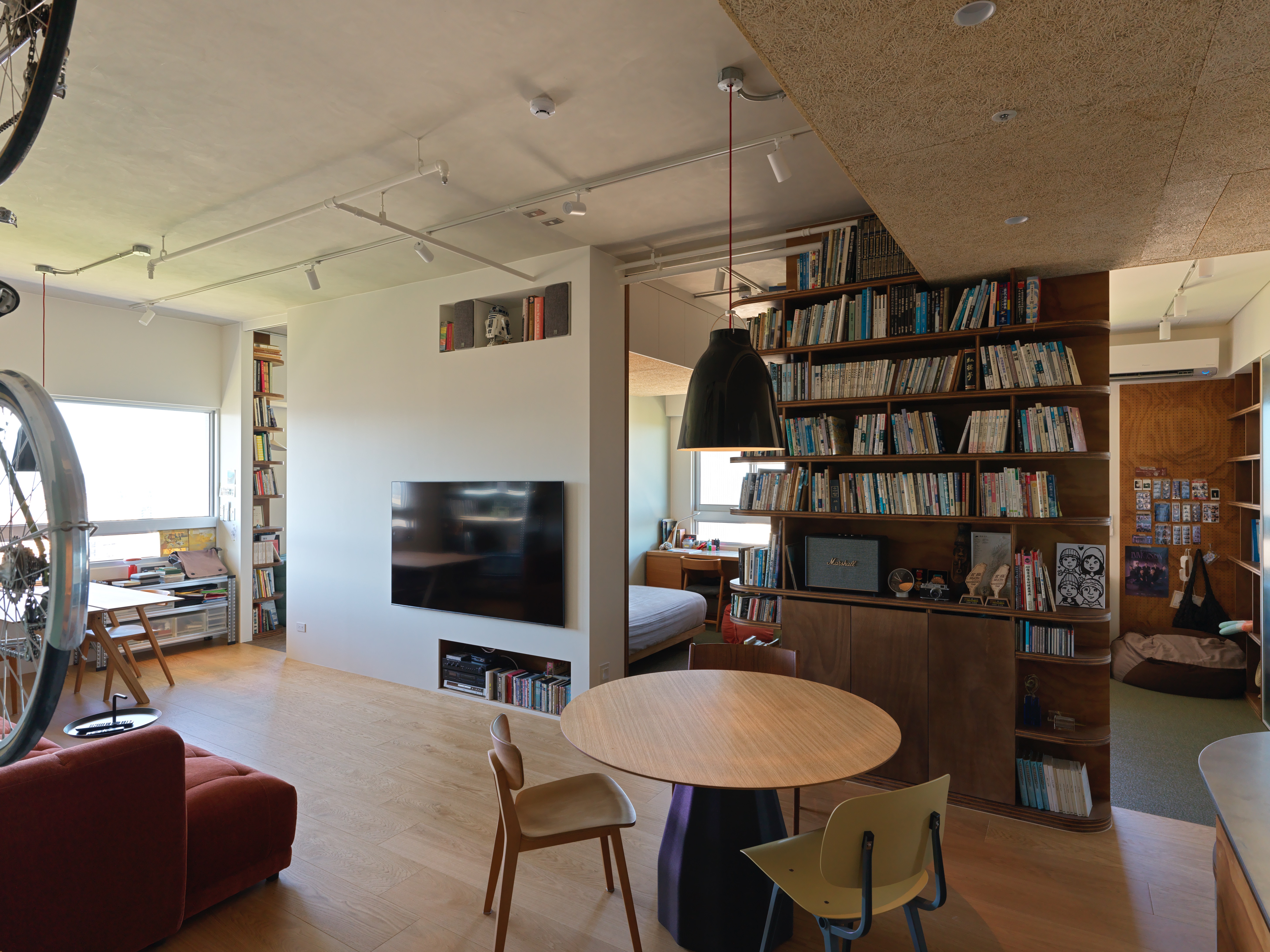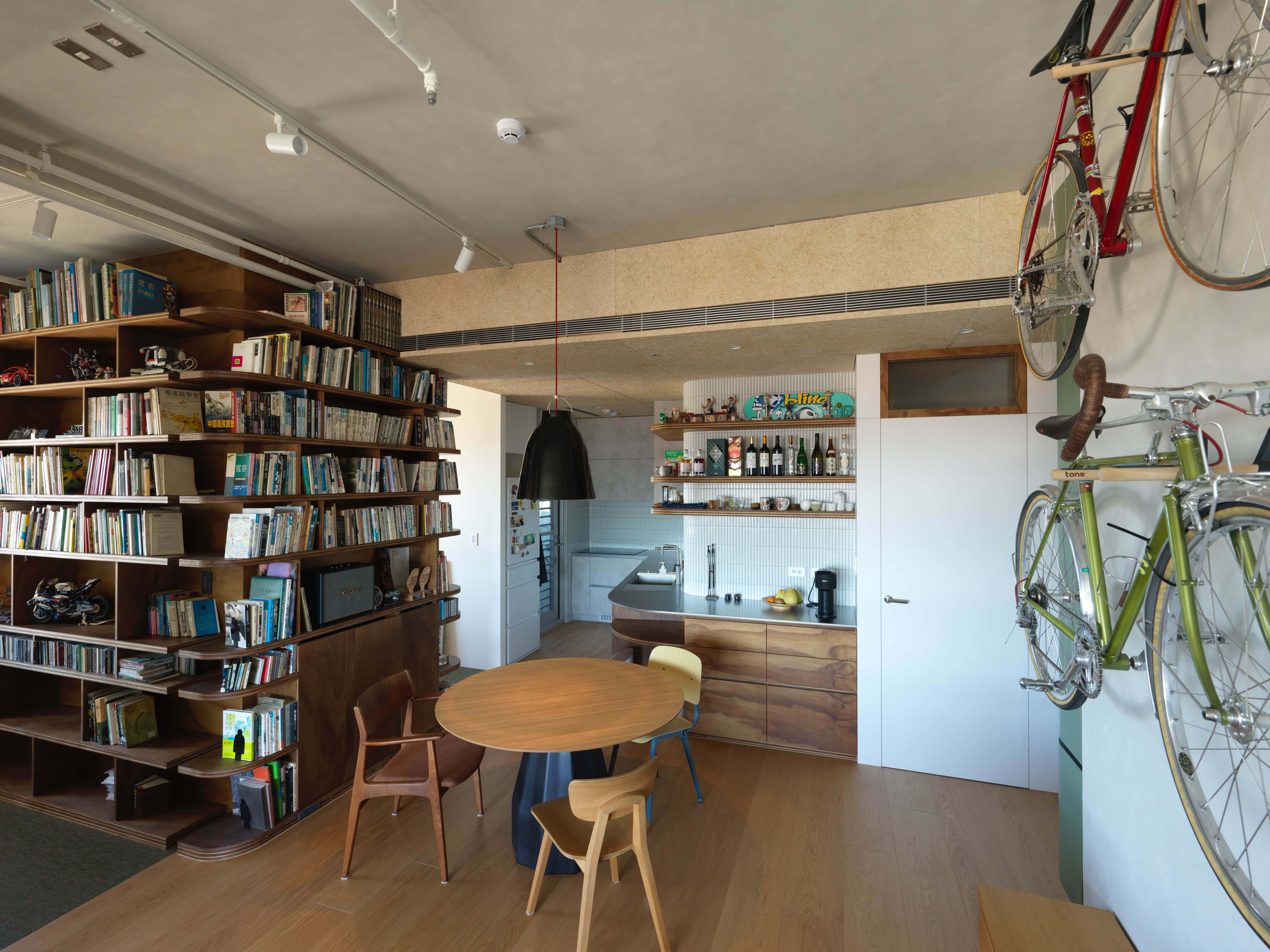 擁有專業建築背景的業主,在平面配置與空間機能上有很清楚的敘述與想像.例如到頂的房間開口(平常打開的時候房間不像是一個房間而是開放空間的延伸)、不只整面而且要能延伸到房間內像是圖書館的書牆、多功能的練團與運動空間、不規則檯面的開放式廚房、配合原有家具與新購層架的工作區、四部腳踏車收納結合展示的功能等等. 但是業主在材料、顏色、與工法上給予我們很大的空間.因為這些非常態的機能不能用一般的材質與施工邏輯進行,很多時候都必須與不同工班討論與實驗出一個最佳解決方案.