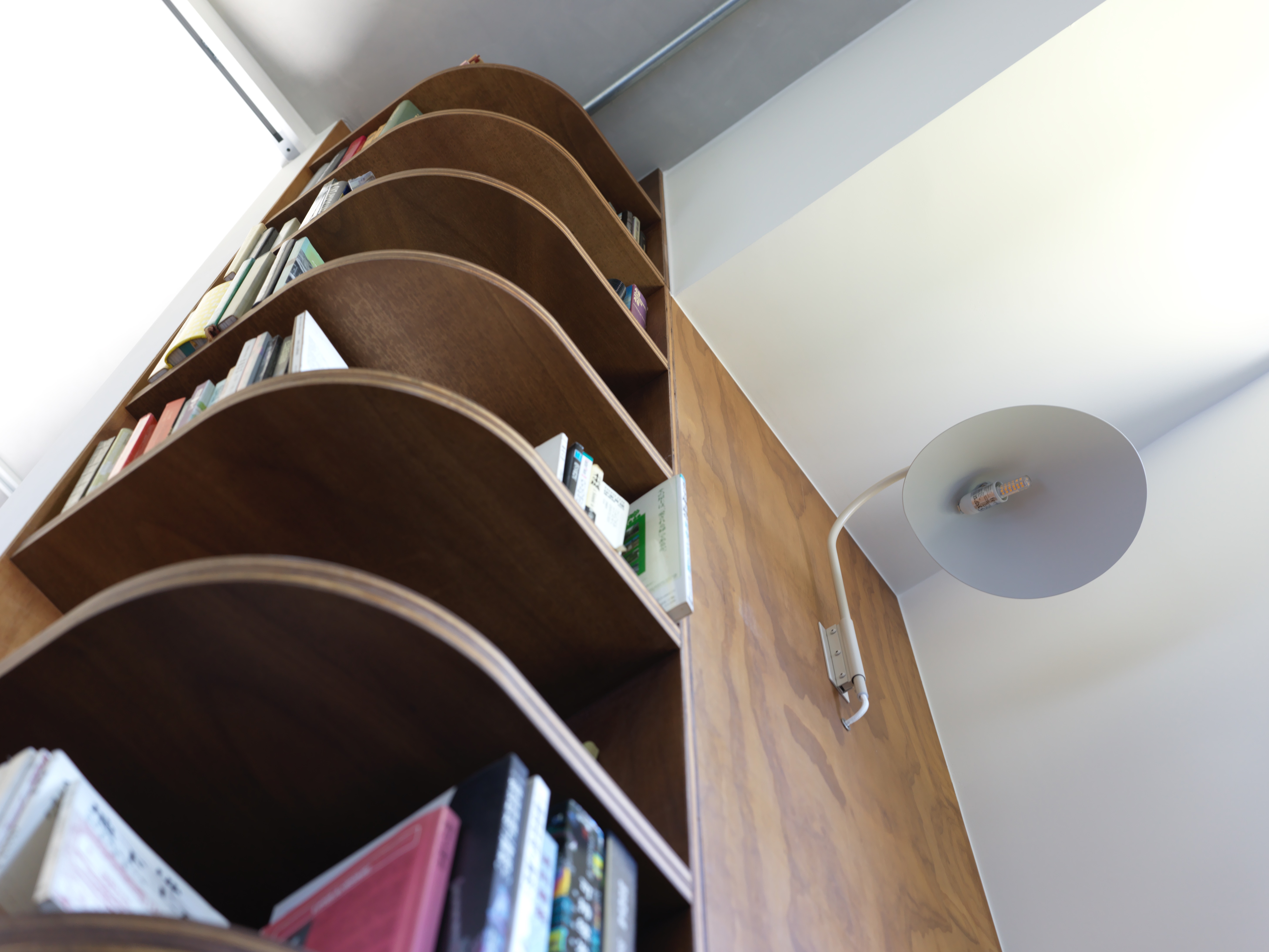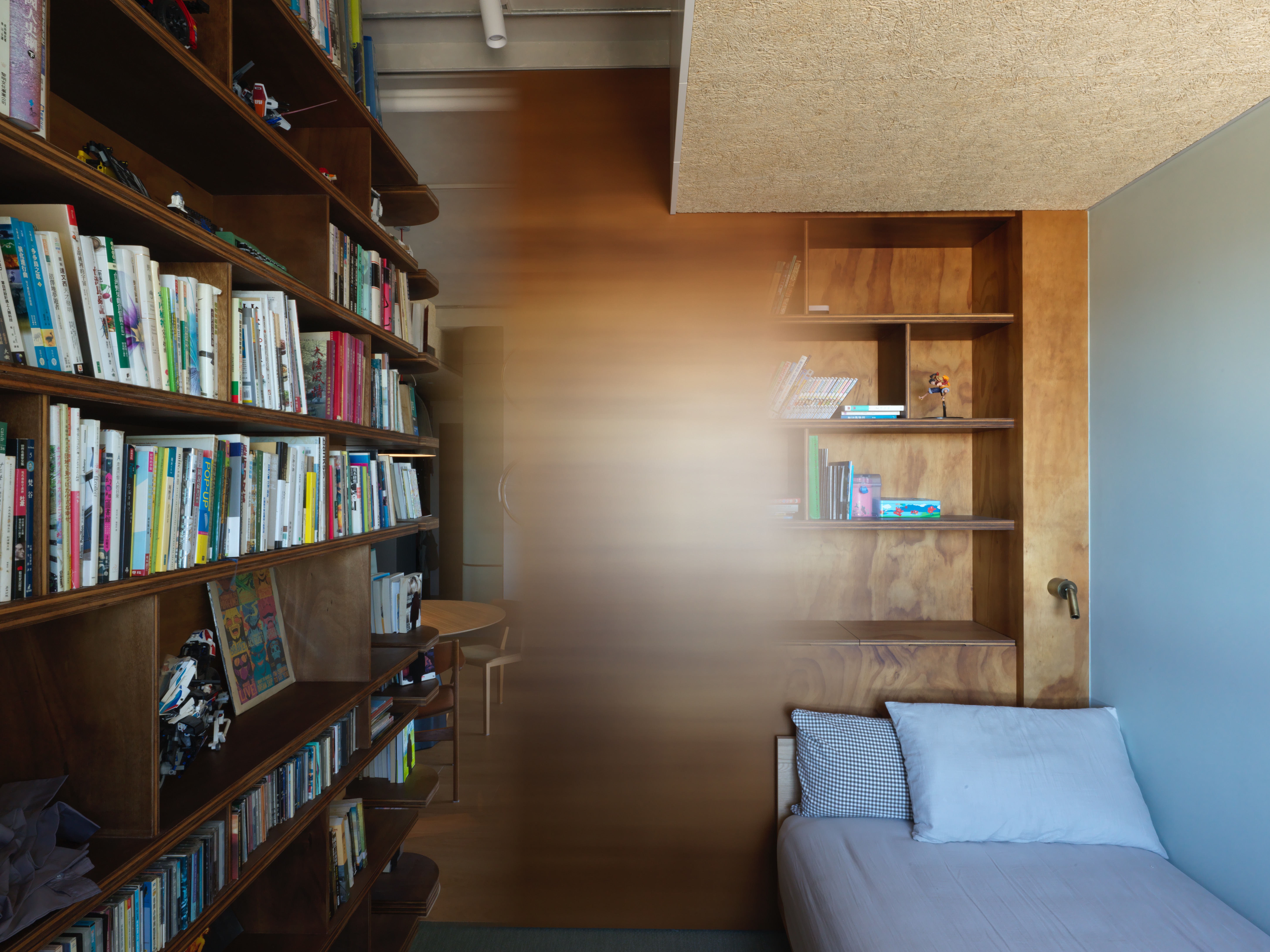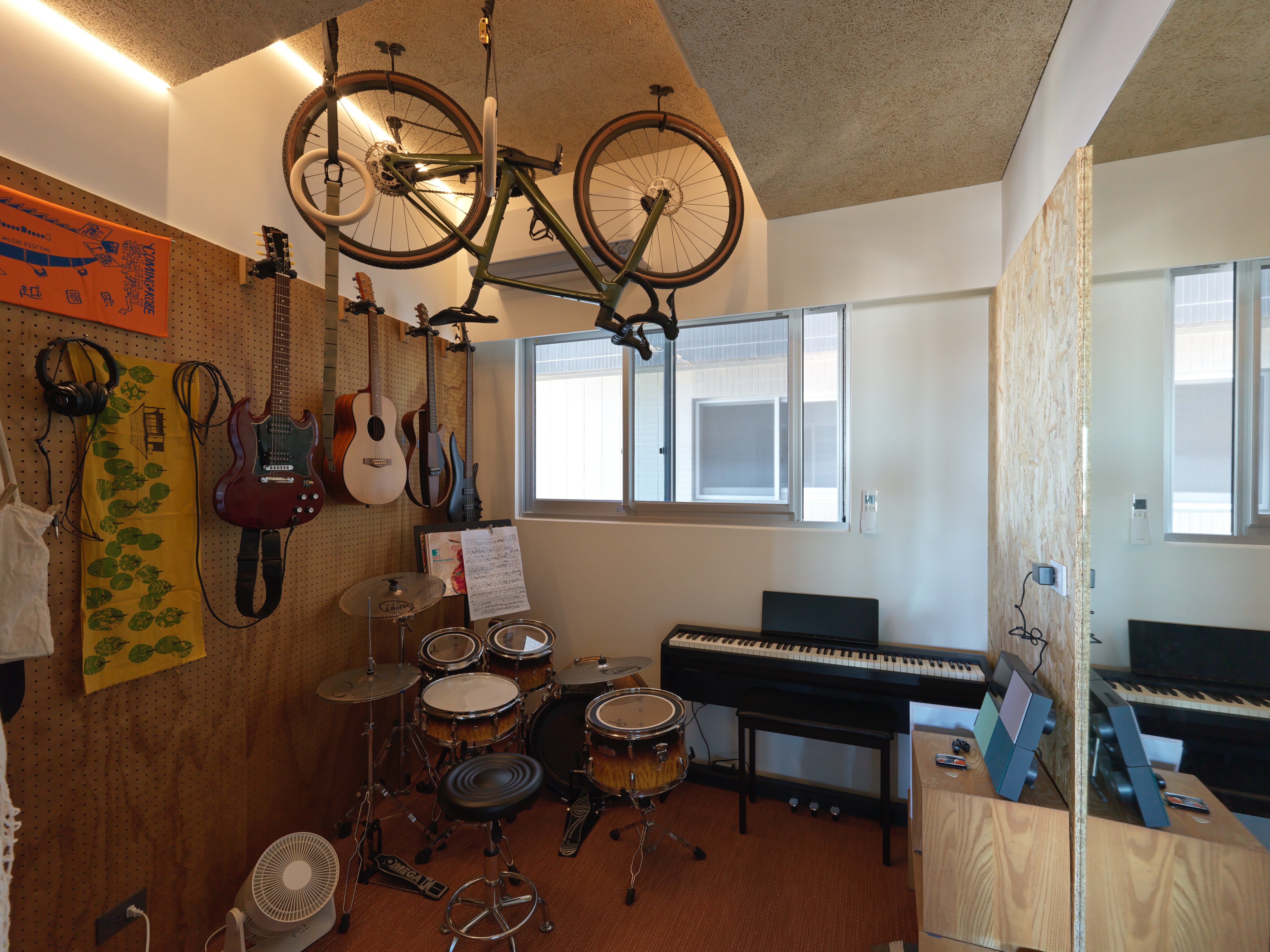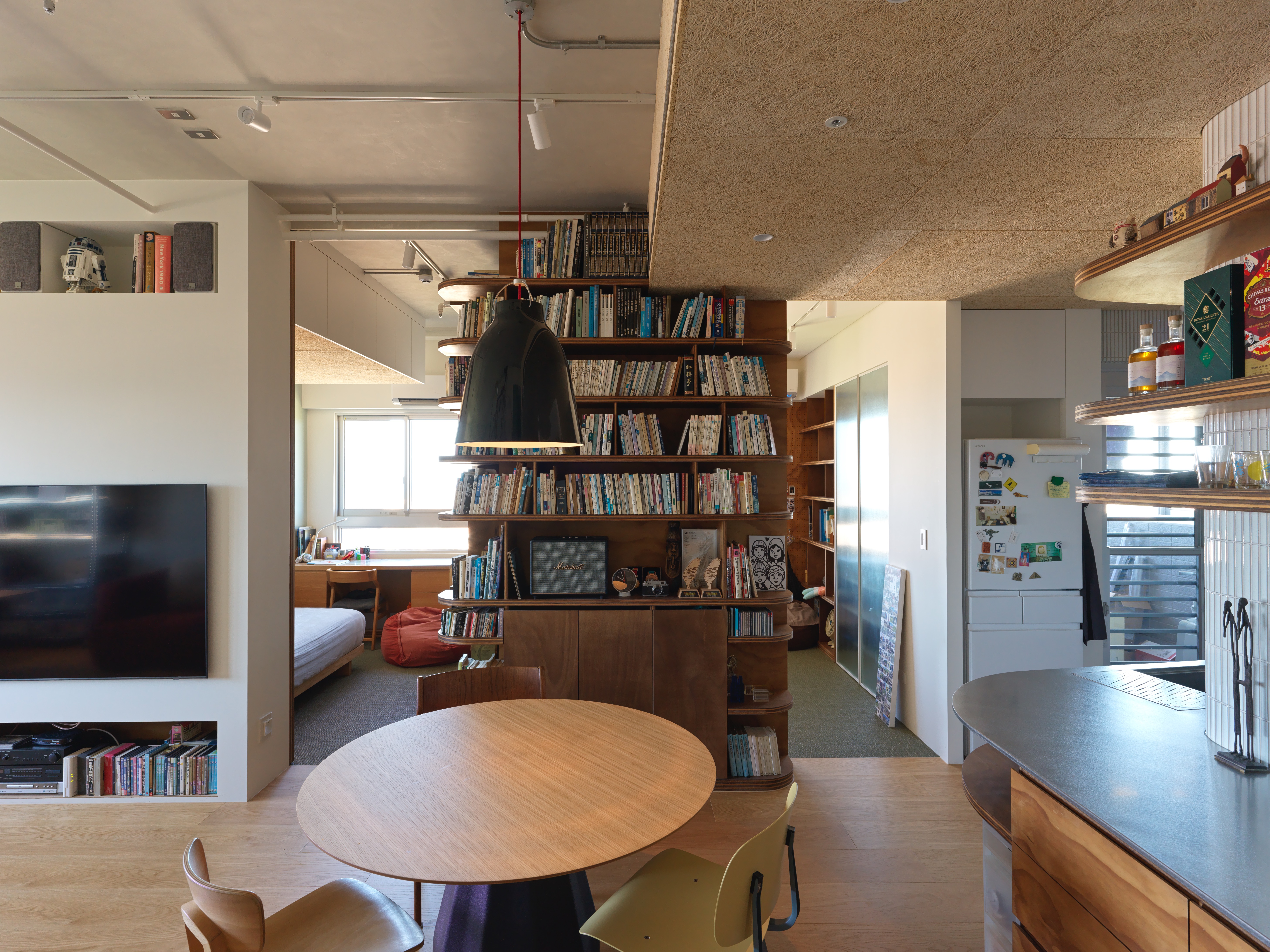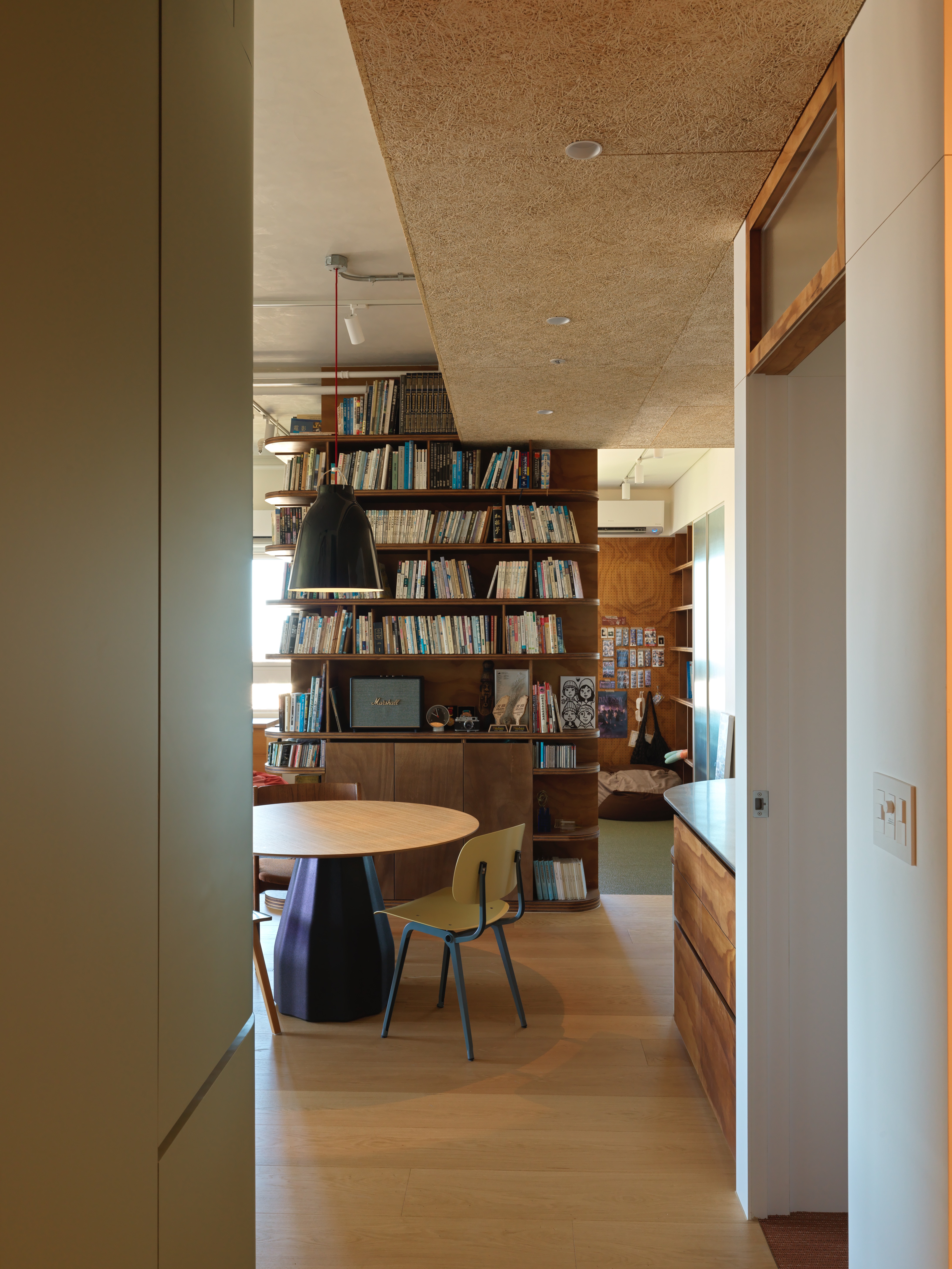 擁有專業建築背景的業主,在平面配置與空間機能上有很清楚的敘述與想像.例如到頂的房間開口(平常打開的時候房間不像是一個房間而是開放空間的延伸)、不只整面而且要能延伸到房間內像是圖書館的書牆、多功能的練團與運動空間、不規則檯面的開放式廚房、配合原有家具與新購層架的工作區、四部腳踏車收納結合展示的功能等等. 但是業主在材料、顏色、與工法上給予我們很大的空間.因為這些非常態的機能不能用一般的材質與施工邏輯進行,很多時候都必須與不同工班討論與實驗出一個最佳解決方案.