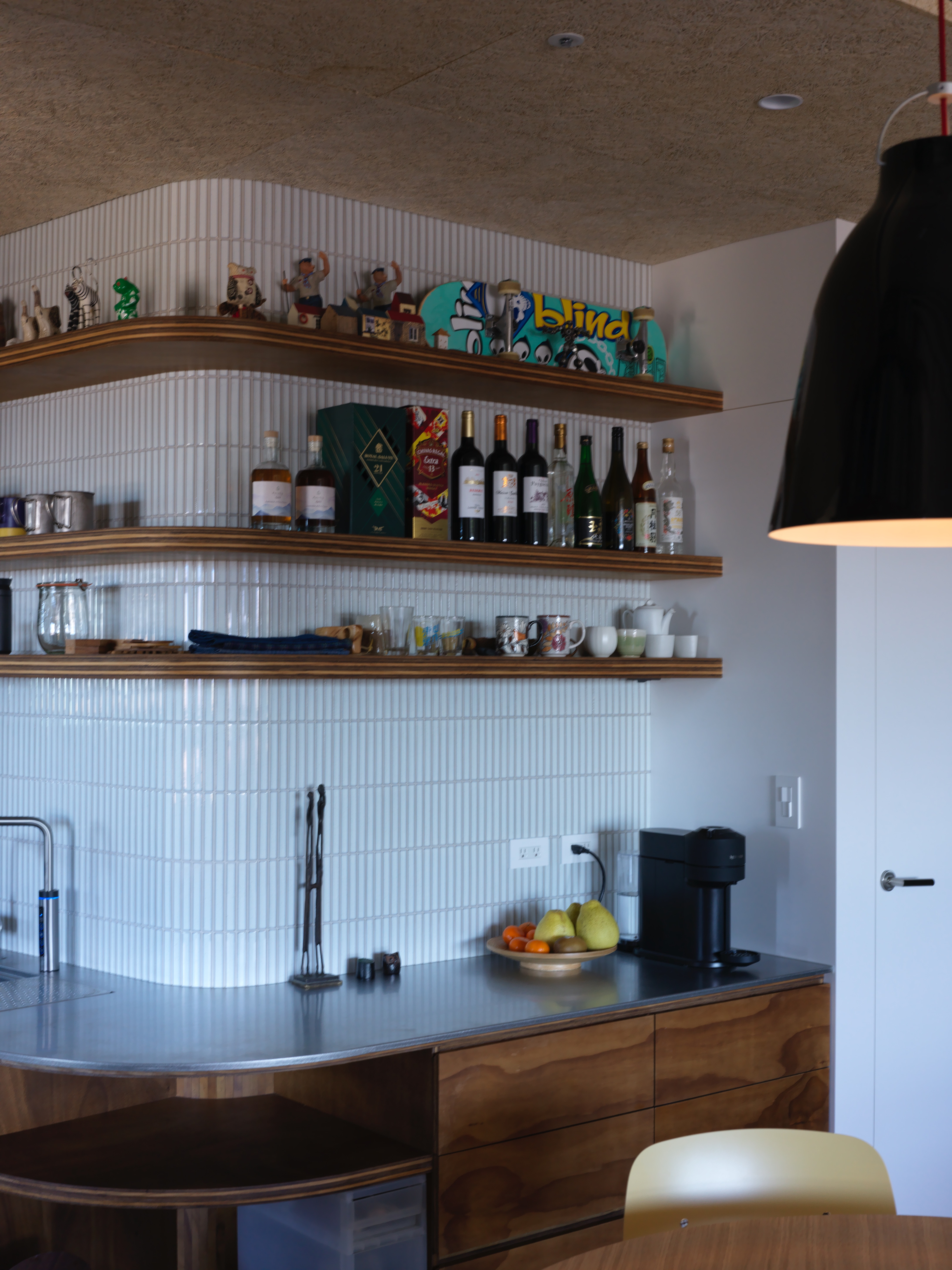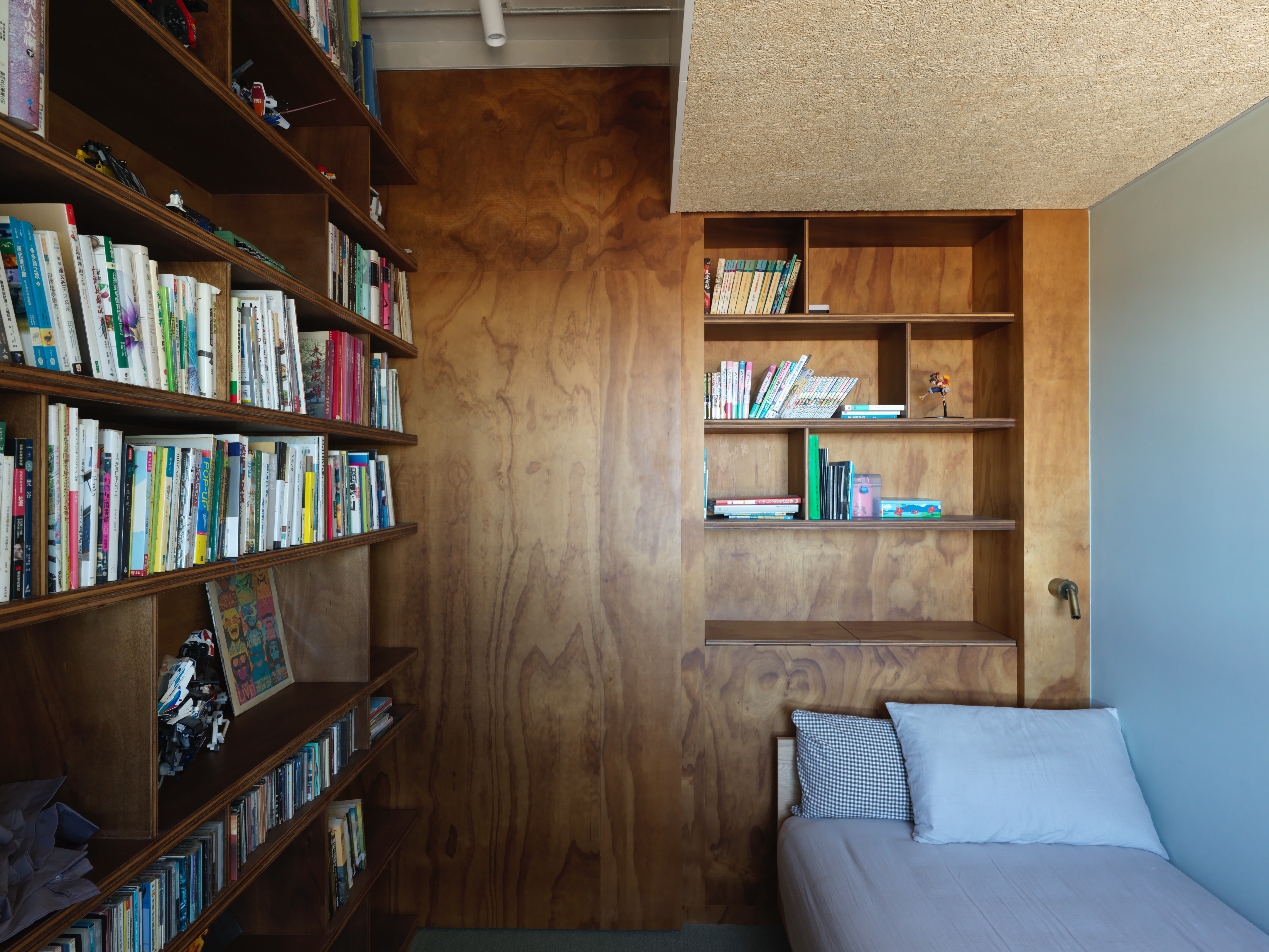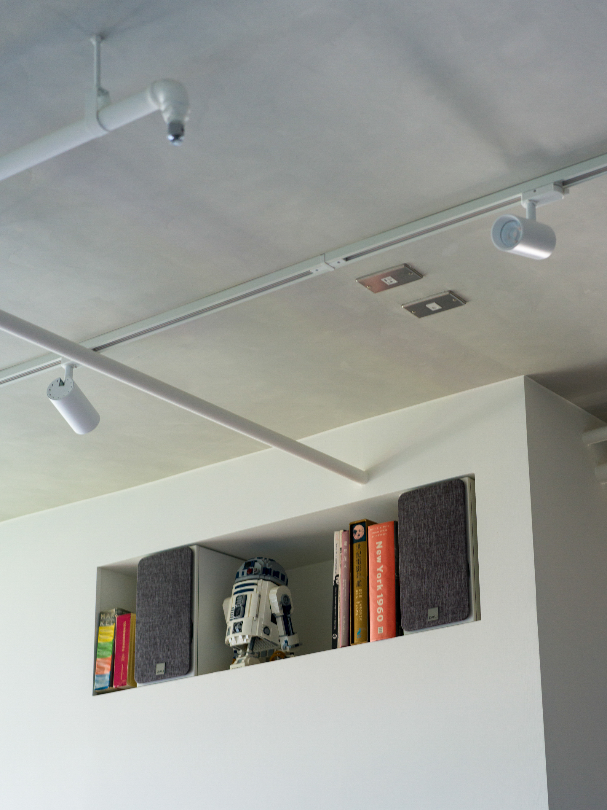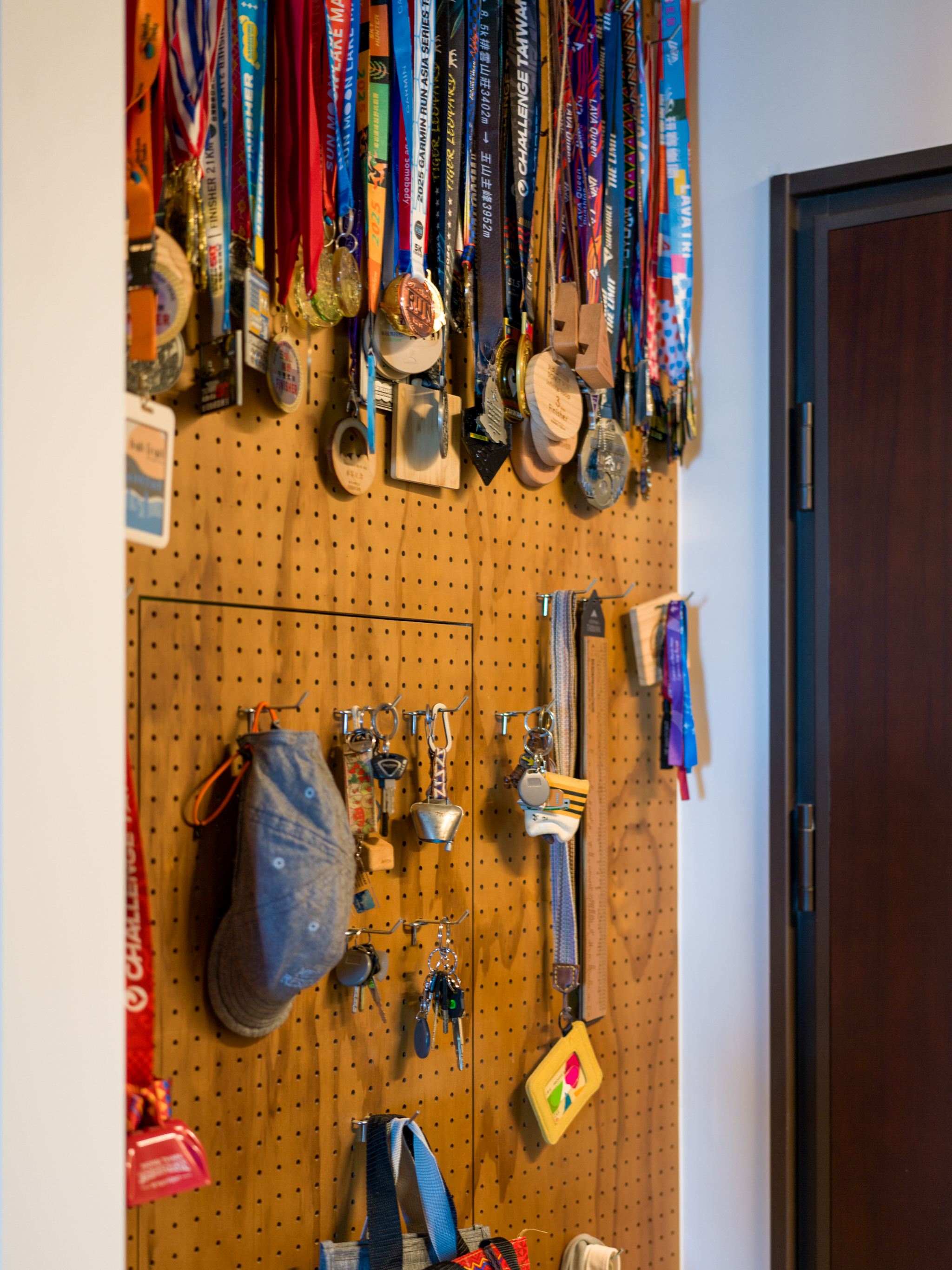擁有專業建築背景的業主,在平面配置與空間機能上有很清楚的敘述與想像.例如到頂的房間開口(平常打開的時候房間不像是一個房間而是開放空間的延伸)、不只整面而且要能延伸到房間內像是圖書館的書牆、多功能的練團與運動空間、不規則檯面的開放式廚房、配合原有家具與新購層架的工作區、四部腳踏車收納結合展示的功能等等. 但是業主在材料、顏色、與工法上給予我們很大的空間.因為這些非常態的機能不能用一般的材質與施工邏輯進行,很多時候都必須與不同工班討論與實驗出一個最佳解決方案.