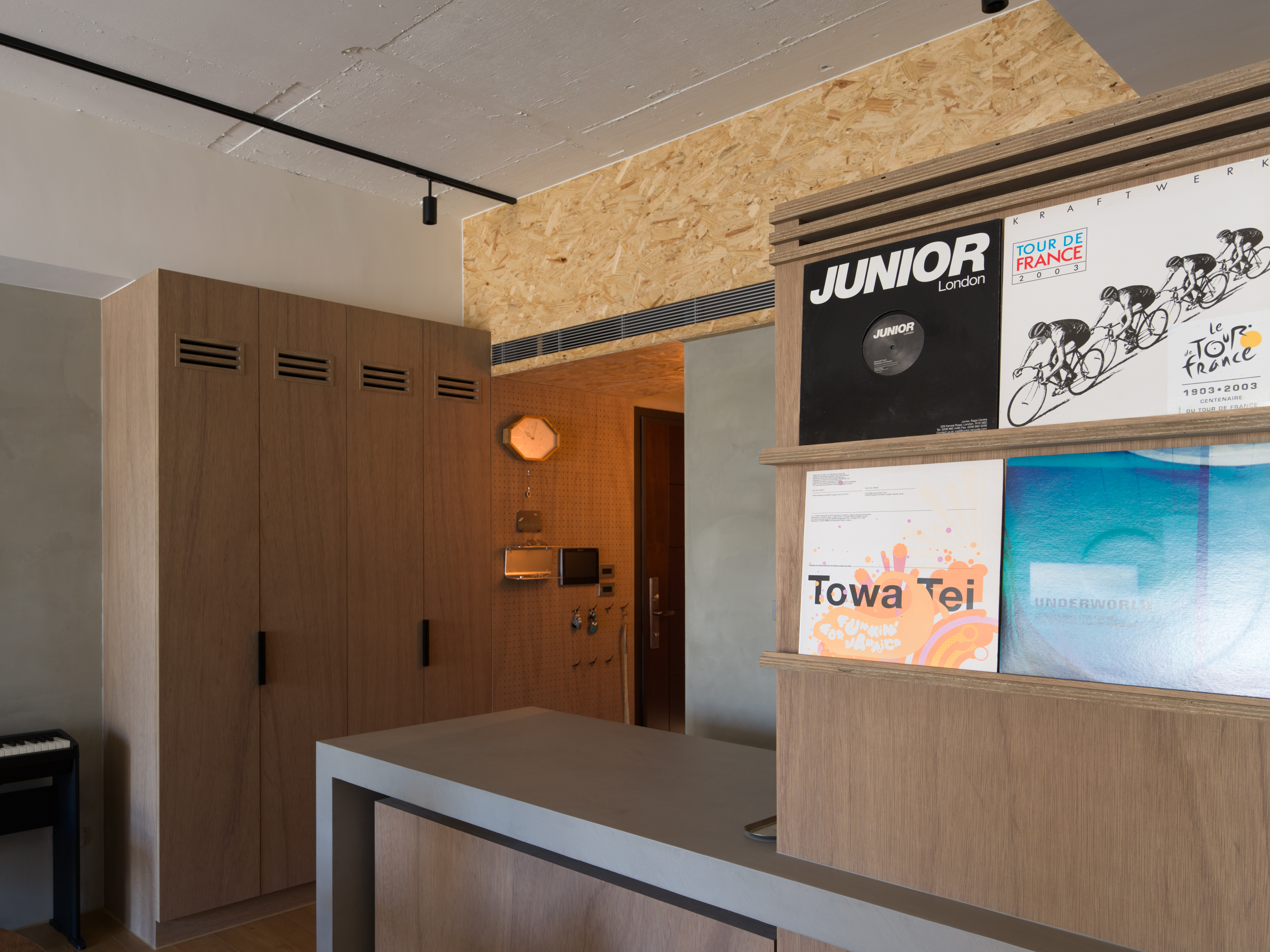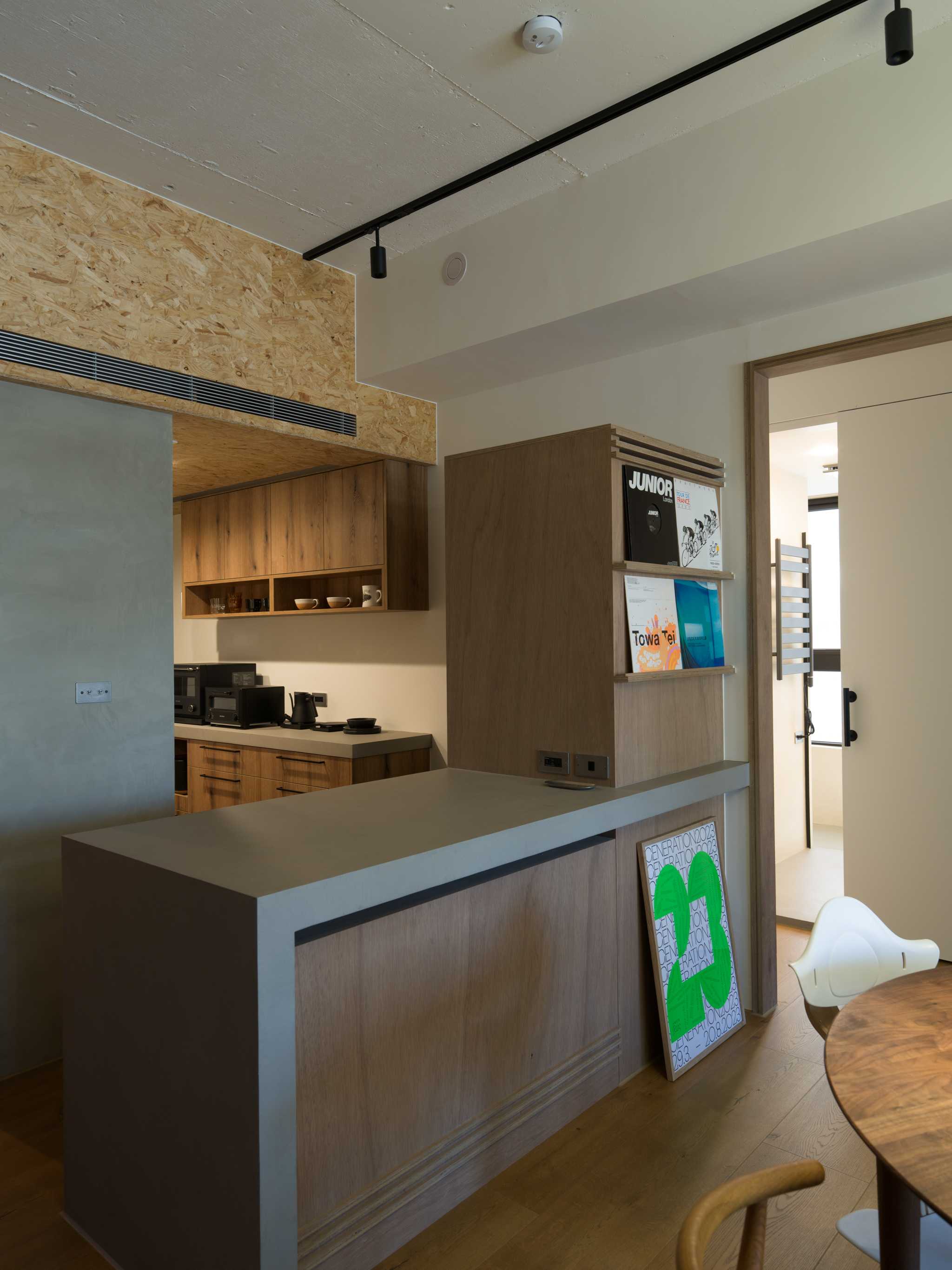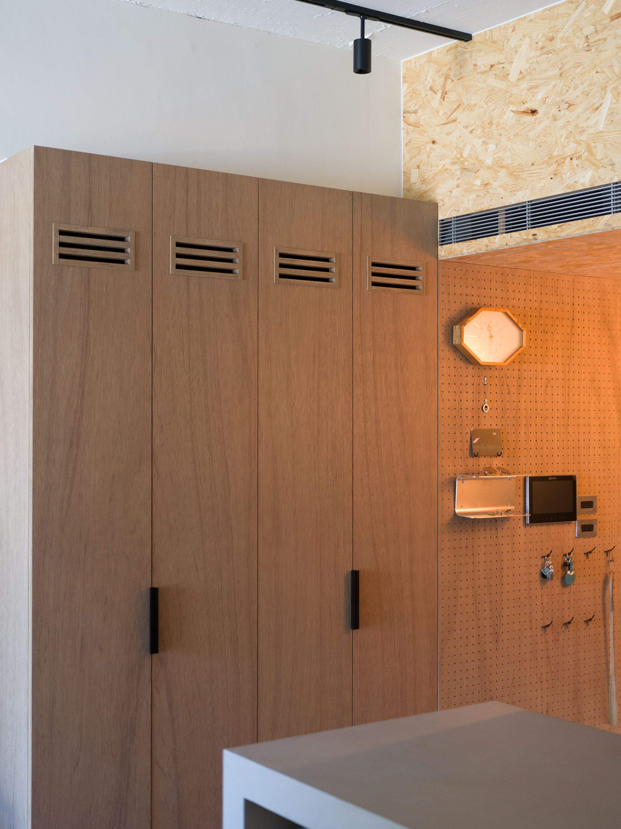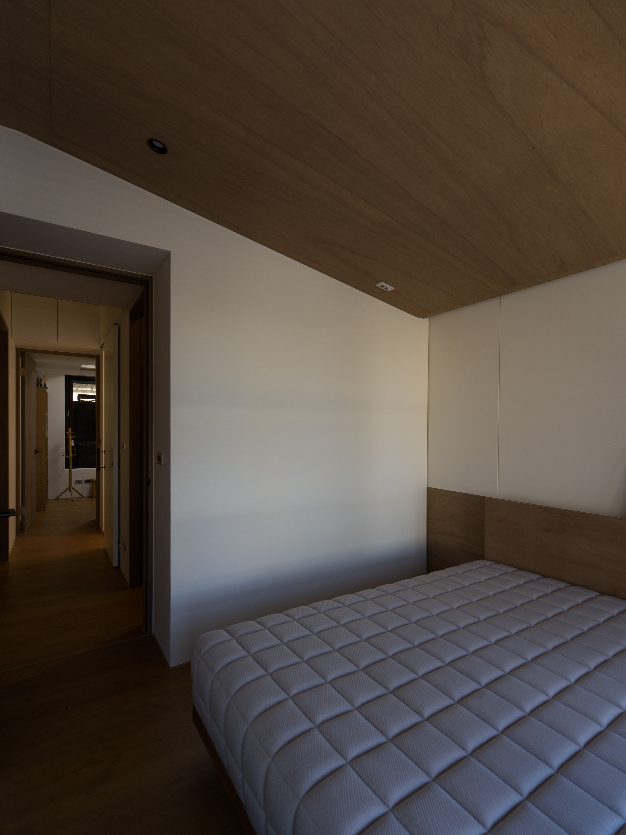 這個案子還有一個非常特別的地方,那就是全室只使用同一種木作材料,就是夾板。用再普通不過的夾板拿來當作完成面,就是一件非常不普通(而且困難)的事。為了實現業主的期待,我們翻找了目前市面上各大夾板廠,從中挑出符合我們期待的花紋與顏色,而且依照板材厚度不同可能還是不同廠家,非常麻煩。至於夾板的施工,還有一些斷面的處理,都跟一般木作貼皮不同。 越來越多業主喜歡把臥室收納獨立出來,讓睡覺的空間單純只剩下床鋪。我們稍微調整格局,把主臥原本的小廁所讓出來,另外做了一間共用的大更衣室。私領域與公領域中間有個大開口,走廊兩側上方都做了隱藏吊櫃。有限的空間還是可以利用設計創造出額外的收納。