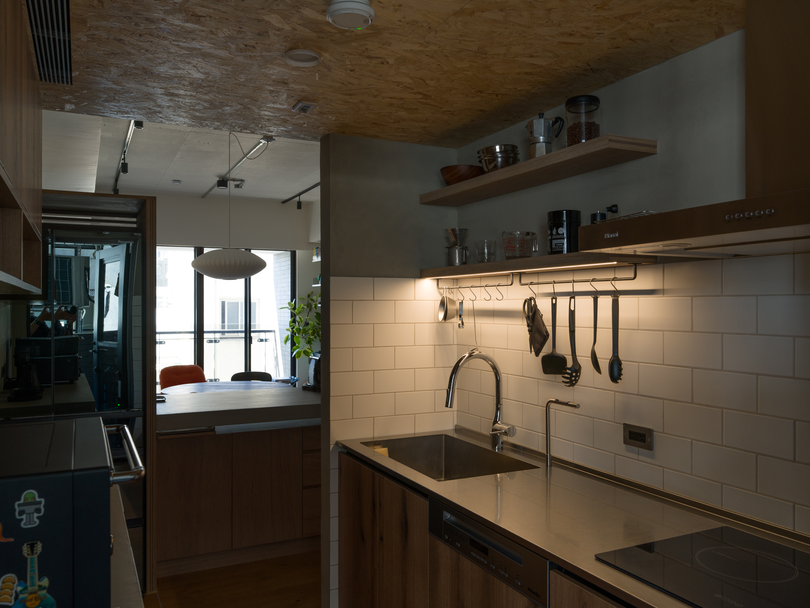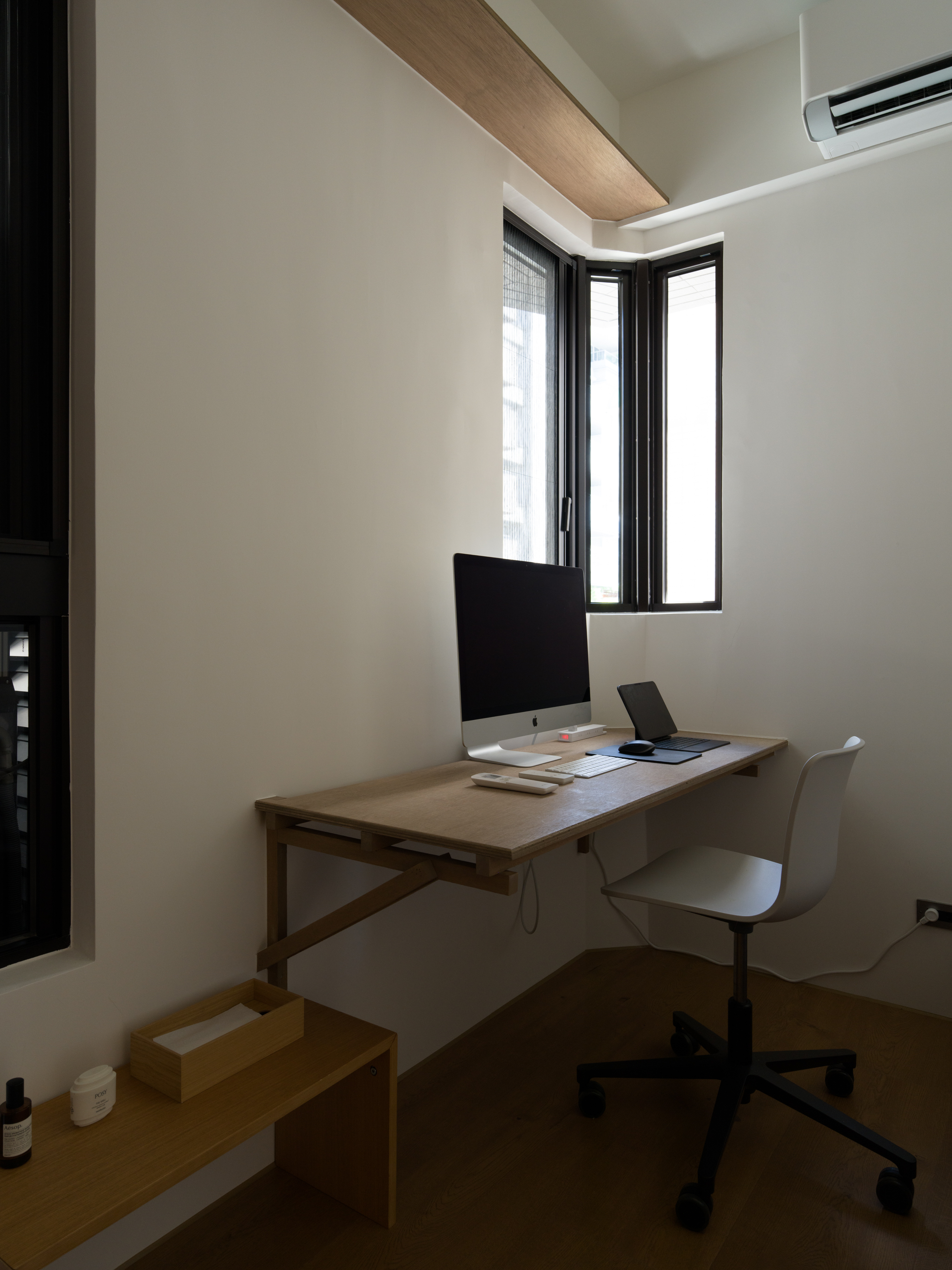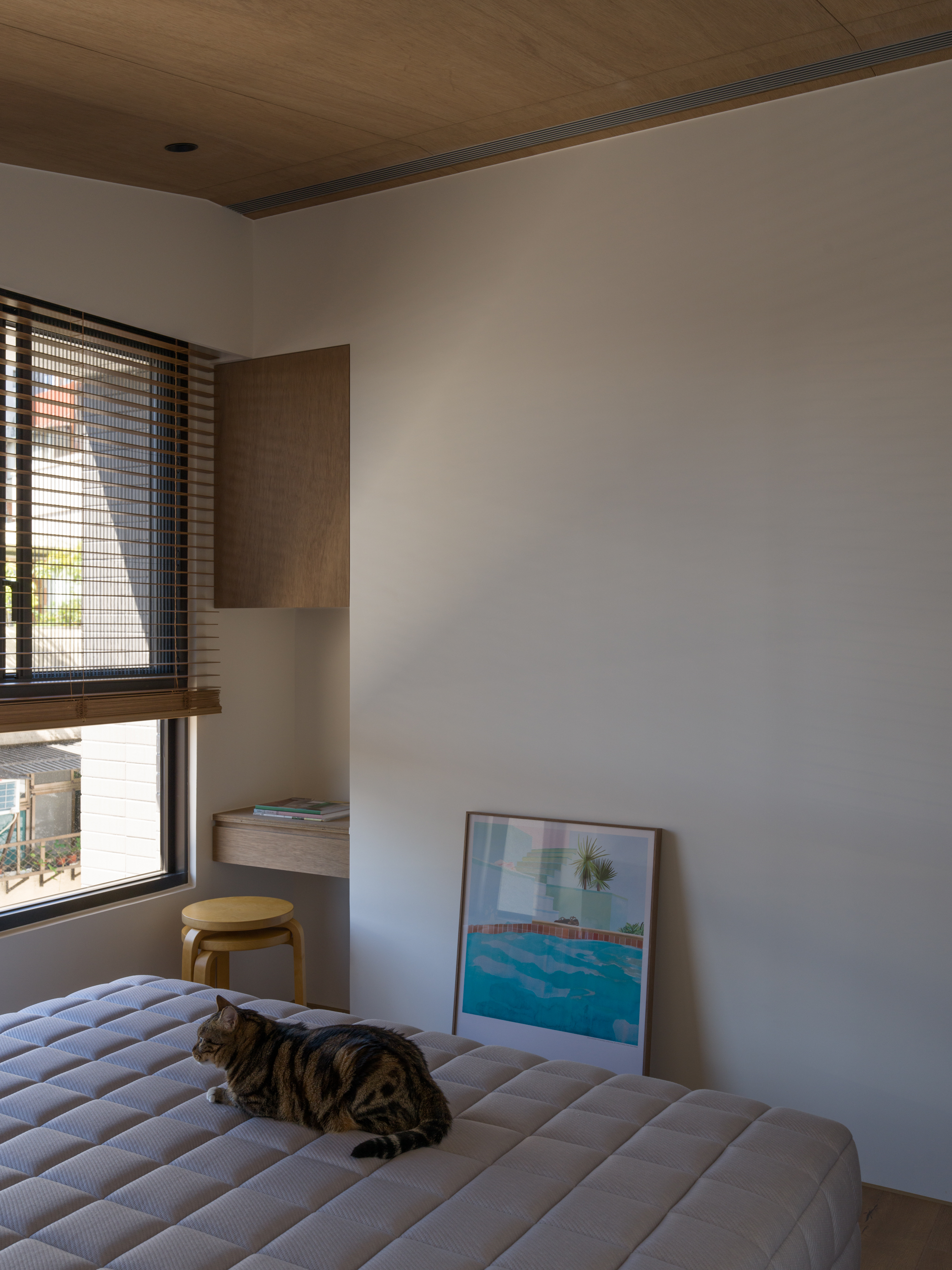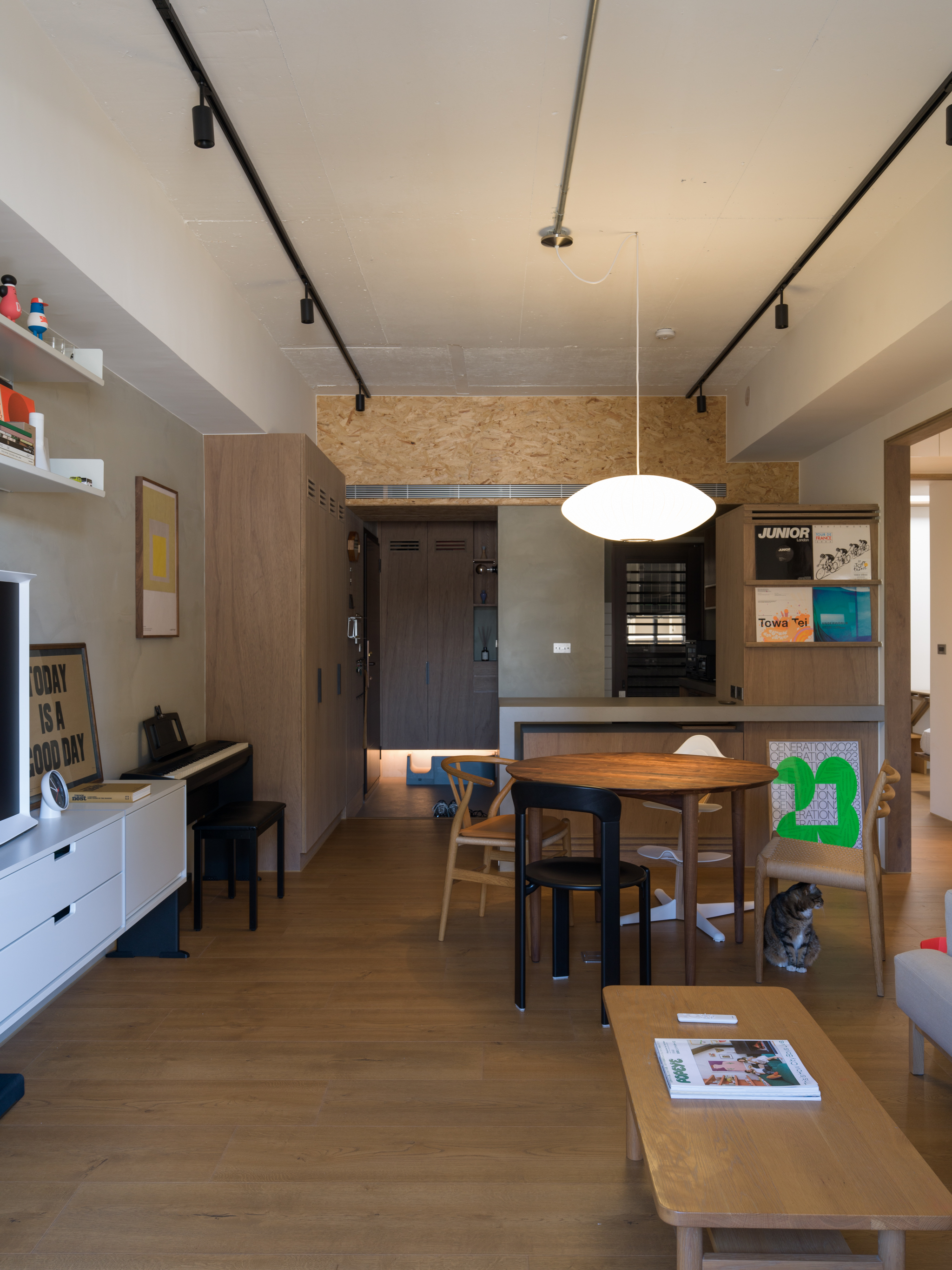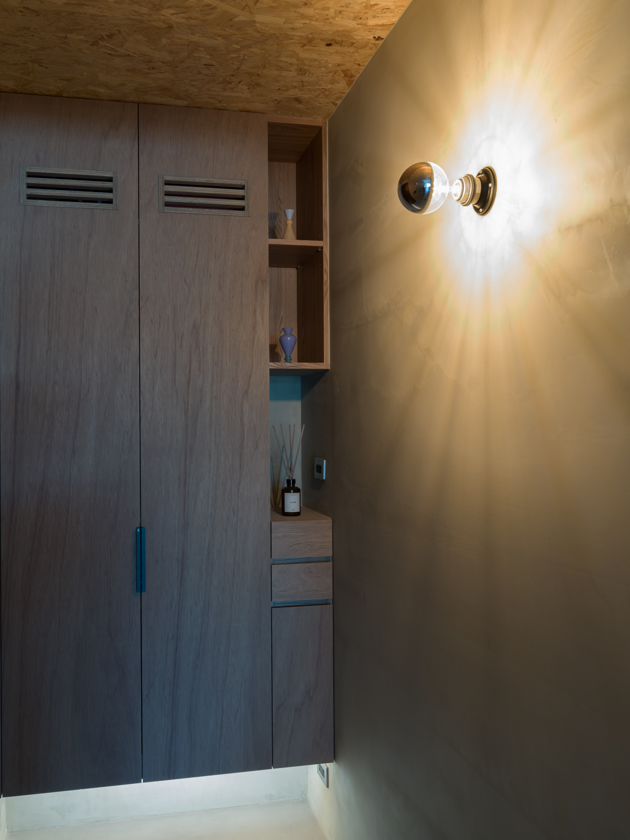 這個案子還有一個非常特別的地方,那就是全室只使用同一種木作材料,就是夾板。用再普通不過的夾板拿來當作完成面,就是一件非常不普通(而且困難)的事。為了實現業主的期待,我們翻找了目前市面上各大夾板廠,從中挑出符合我們期待的花紋與顏色,而且依照板材厚度不同可能還是不同廠家,非常麻煩。至於夾板的施工,還有一些斷面的處理,都跟一般木作貼皮不同。 越來越多業主喜歡把臥室收納獨立出來,讓睡覺的空間單純只剩下床鋪。我們稍微調整格局,把主臥原本的小廁所讓出來,另外做了一間共用的大更衣室。私領域與公領域中間有個大開口,走廊兩側上方都做了隱藏吊櫃。有限的空間還是可以利用設計創造出額外的收納。
