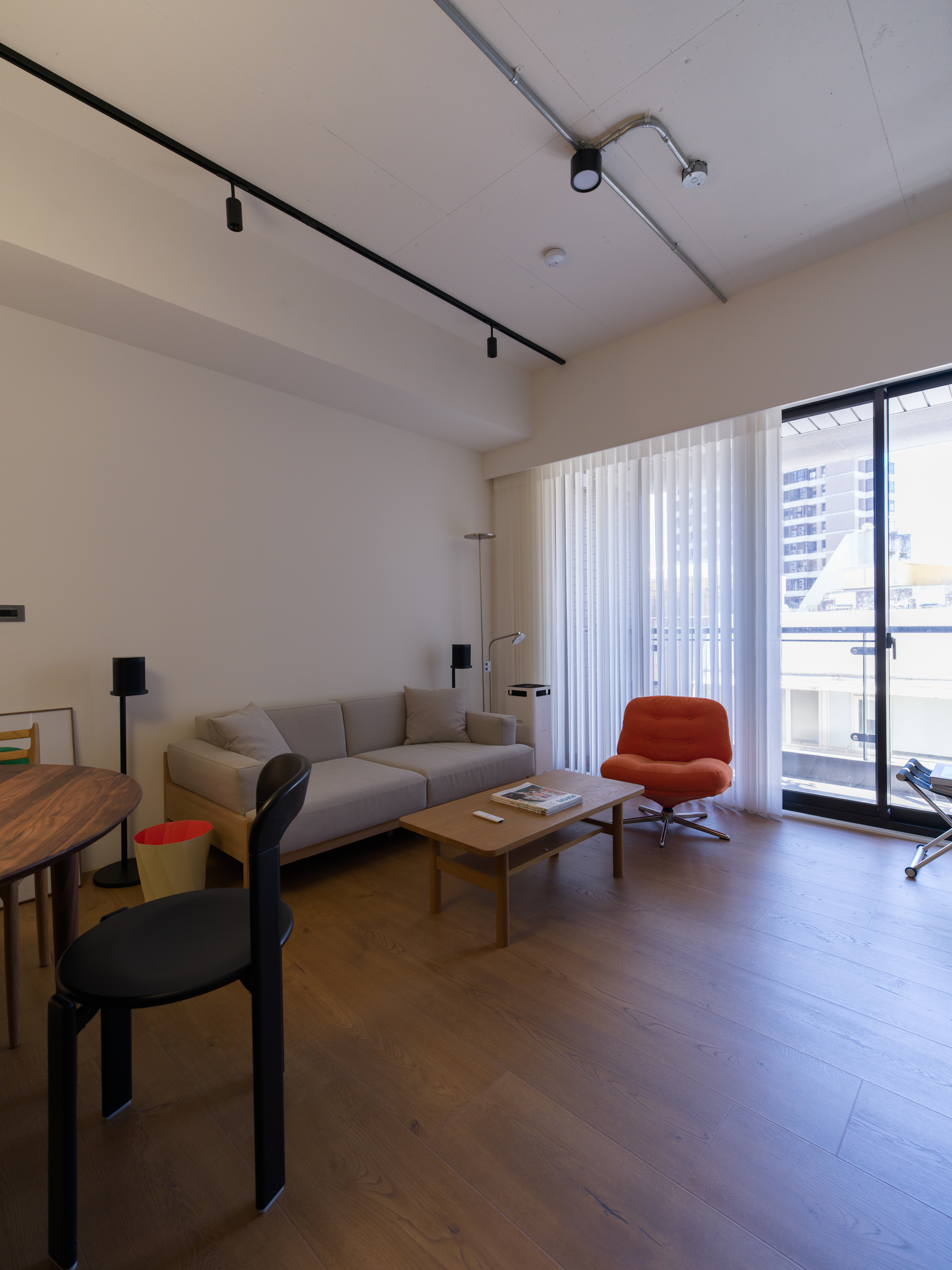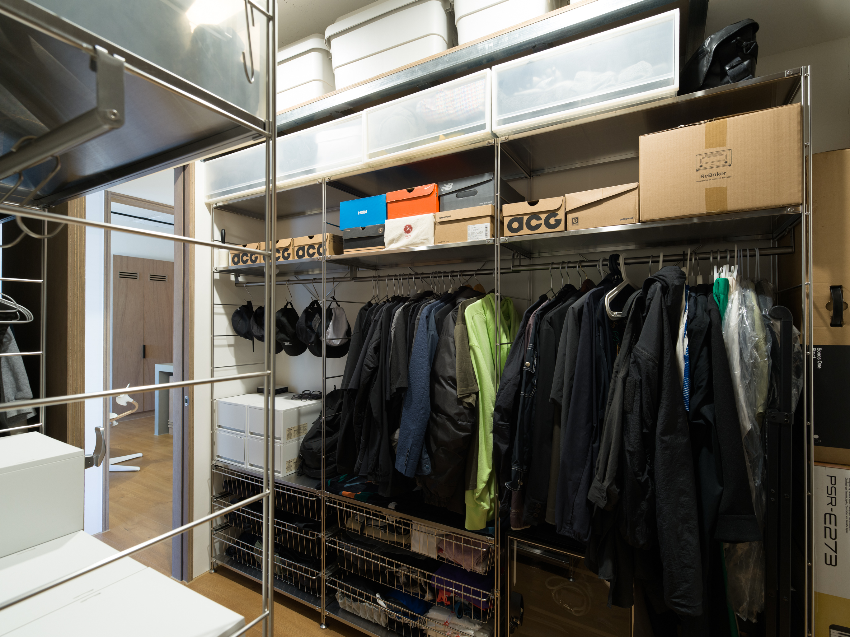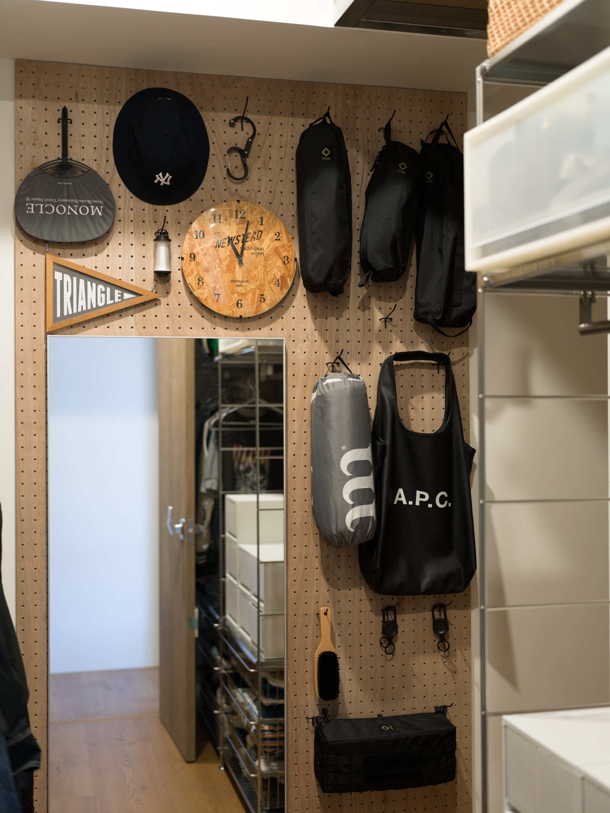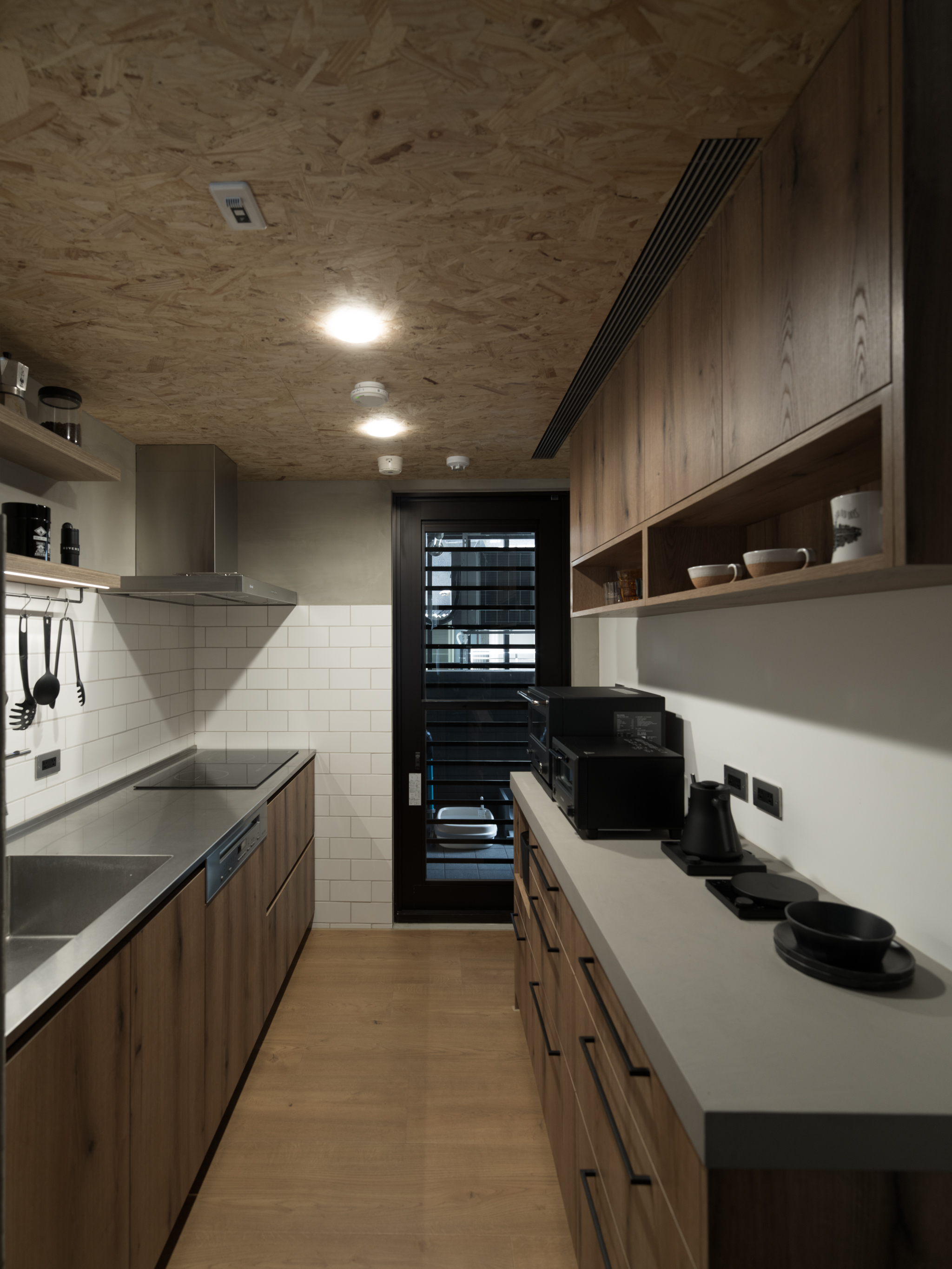 這個案子還有一個非常特別的地方,那就是全室只使用同一種木作材料,就是夾板。用再普通不過的夾板拿來當作完成面,就是一件非常不普通(而且困難)的事。為了實現業主的期待,我們翻找了目前市面上各大夾板廠,從中挑出符合我們期待的花紋與顏色,而且依照板材厚度不同可能還是不同廠家,非常麻煩。至於夾板的施工,還有一些斷面的處理,都跟一般木作貼皮不同。 越來越多業主喜歡把臥室收納獨立出來,讓睡覺的空間單純只剩下床鋪。我們稍微調整格局,把主臥原本的小廁所讓出來,另外做了一間共用的大更衣室。私領域與公領域中間有個大開口,走廊兩側上方都做了隱藏吊櫃。有限的空間還是可以利用設計創造出額外的收納。