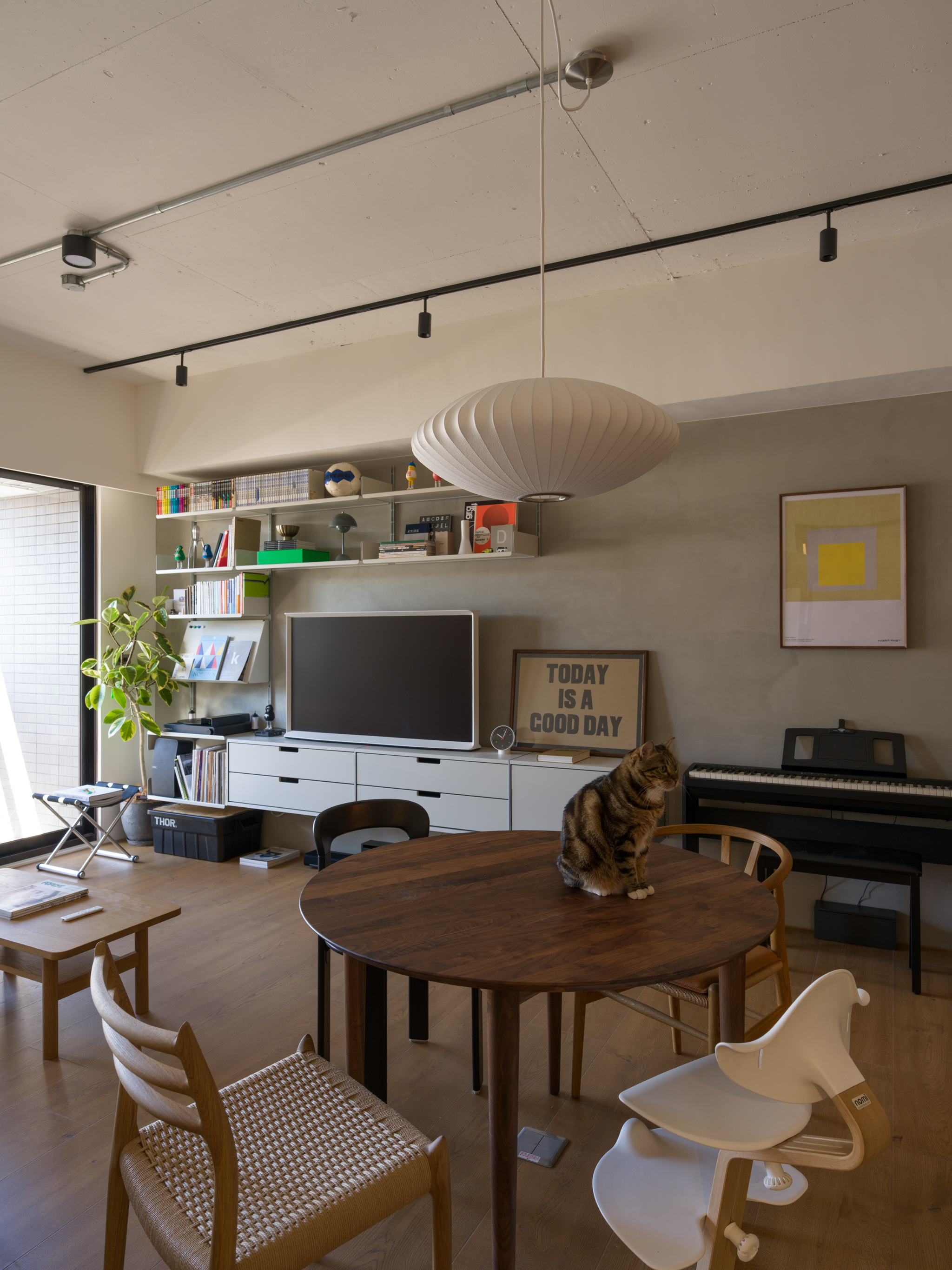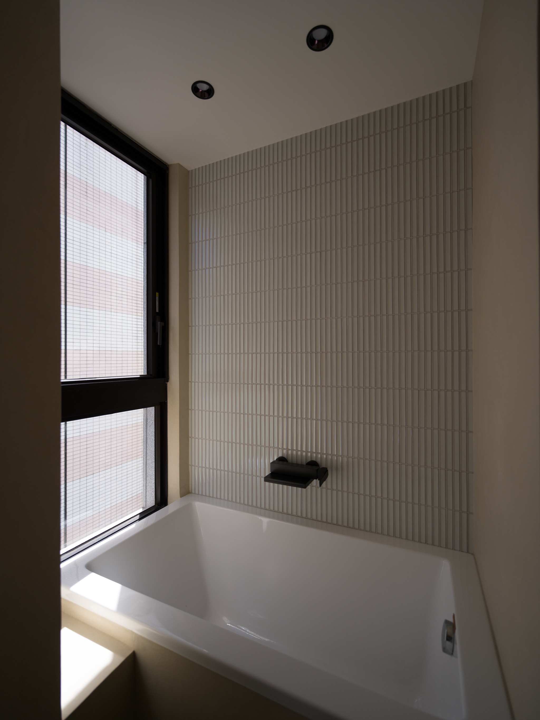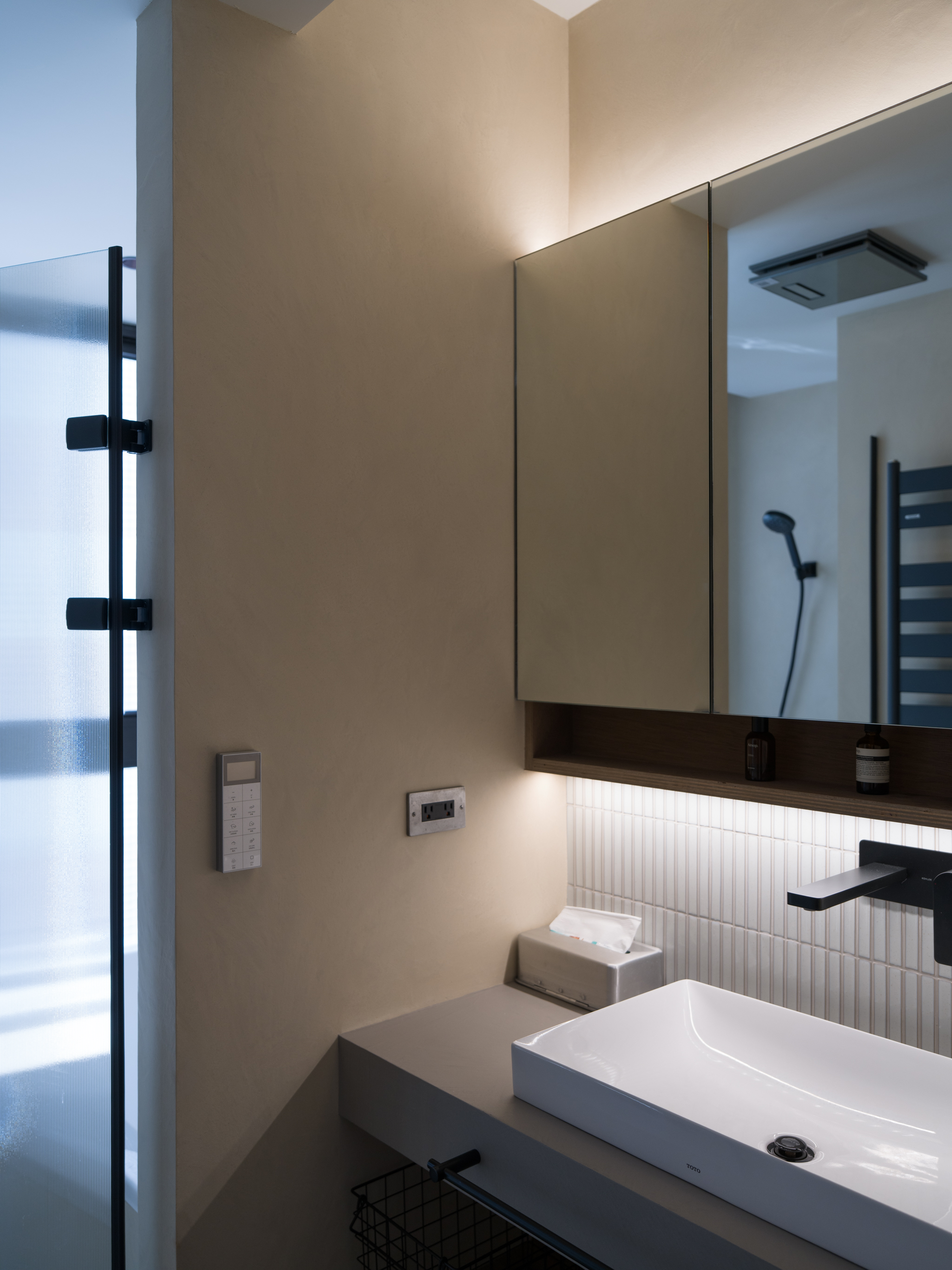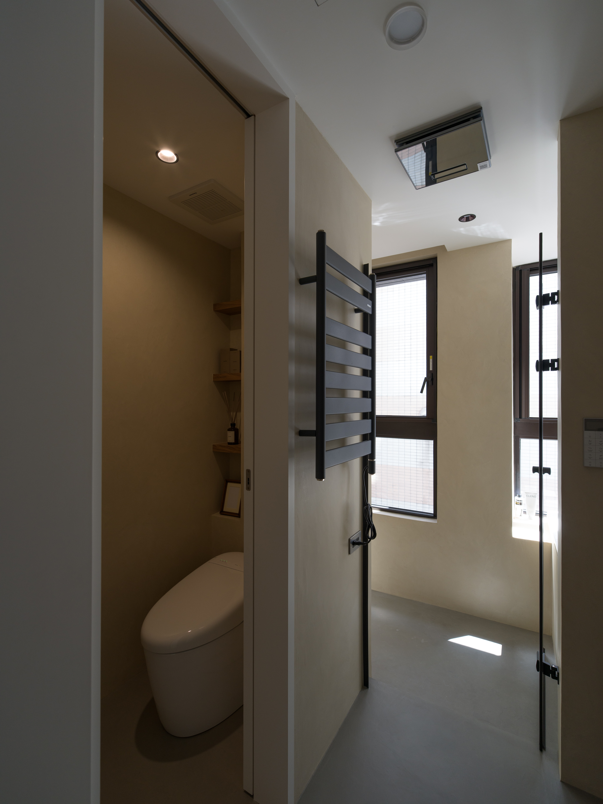 原本業主看上了新家巷口的幼兒園,想像之後每天接送小孩輕鬆的情景。沒想到遇上疫情缺工與都更法規繁瑣,工期延宕了兩年。等到我們進場,小朋友都上小學了... 這個從客變階段我們就參與的案子,因為業主的日籍背景與在日本的生活經驗,我們希望可以在這個空間重塑幾個關乎生活的重點。第一個,就是三分離的浴室空間。去過日本的人都知道,日本對於浴室空間有特別的標準,例如脫衣室(有洗手台的乾區)、有浴缸的濕區(也喜歡坐著淋浴)、獨立的馬桶間等。如何在這個不到2坪的浴室實現如此多的功能,然後又要符合建商的客變限制,實在是一大挑戰。
